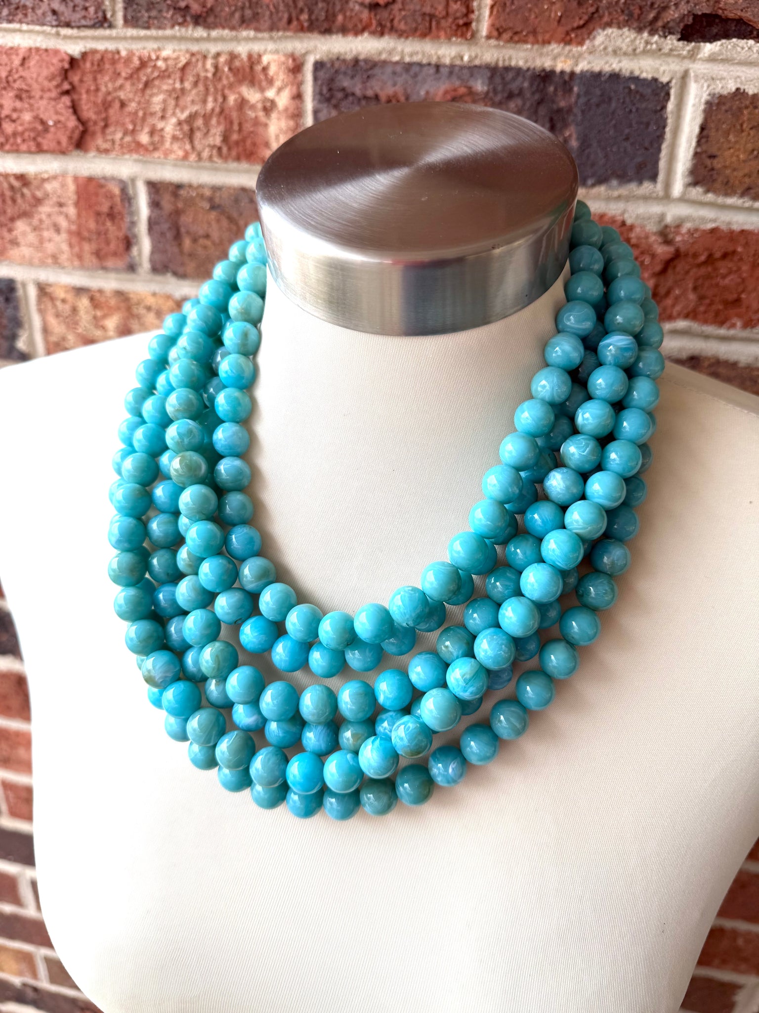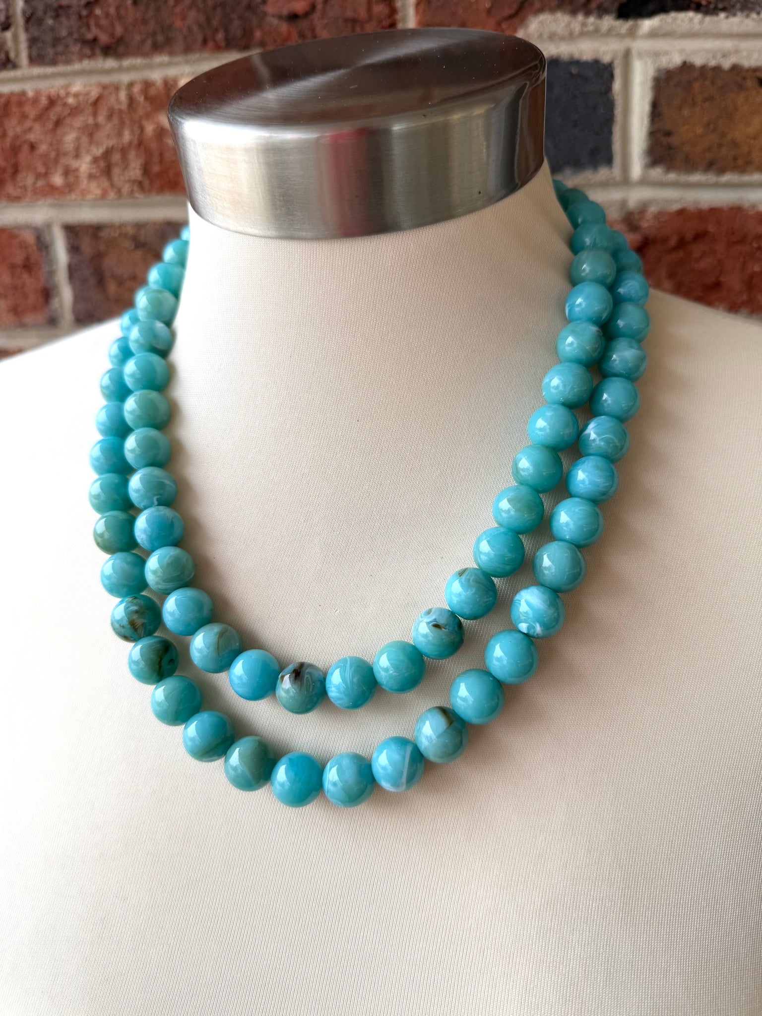 A big beaded multi strand statement necklace made with turquoise blue green acrylic beads. The beads have a white and beige swirl giving it Mid Century vibes.