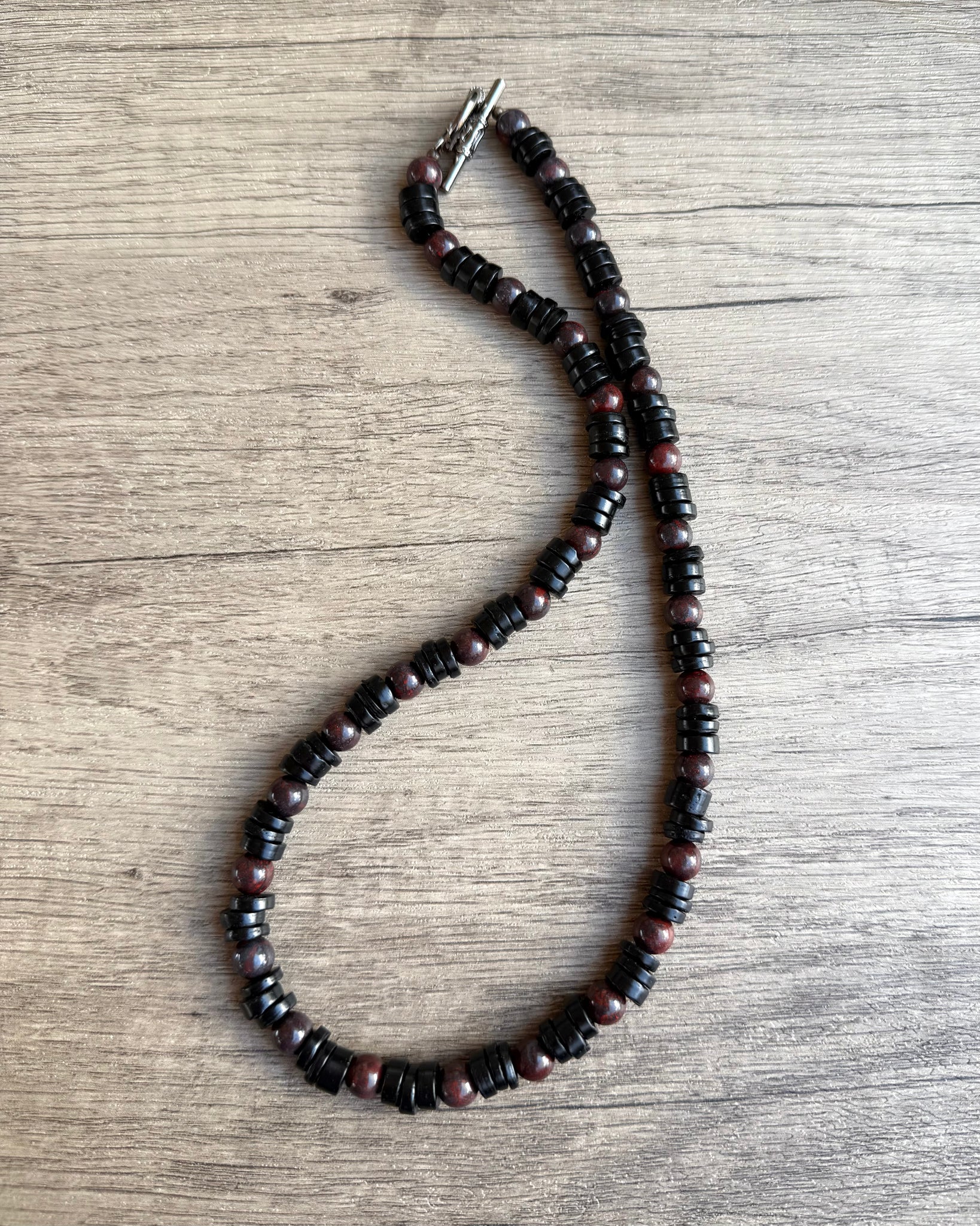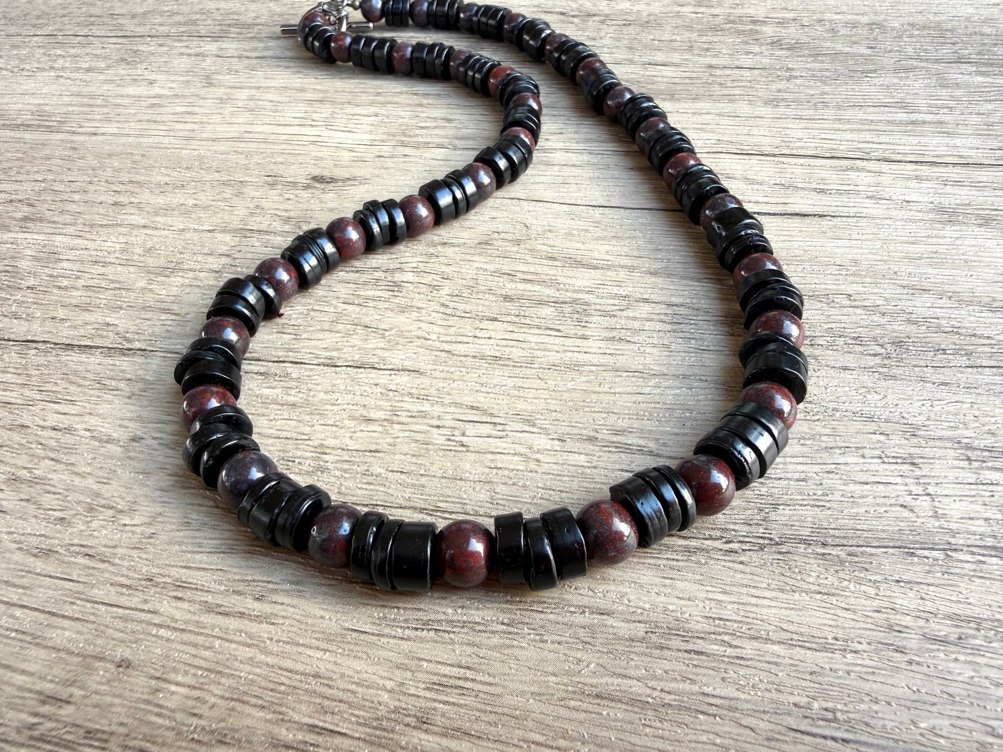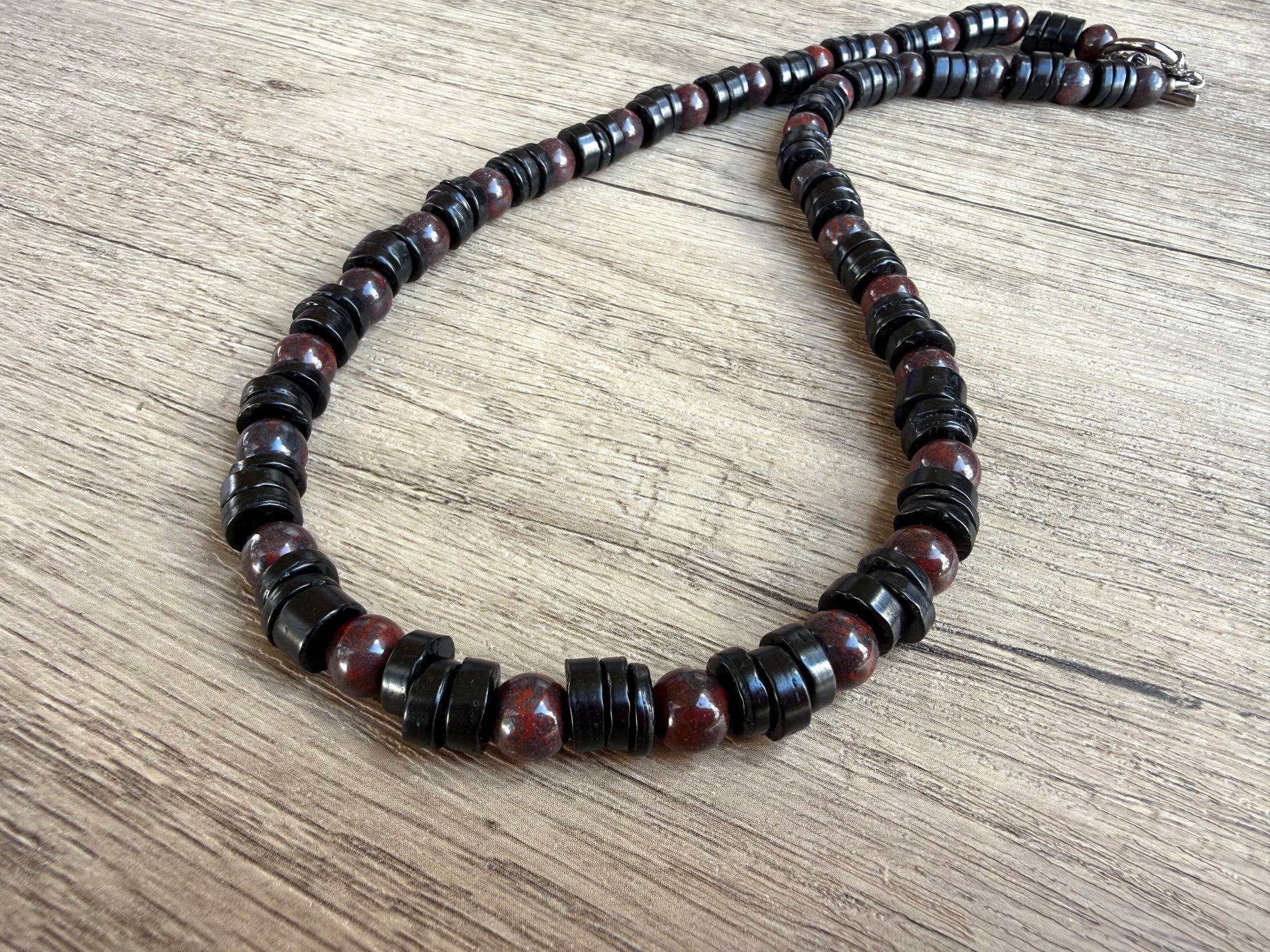 A beaded mens necklace made with black wood and brown jasper stone beads. It has a nice medium weight to it.