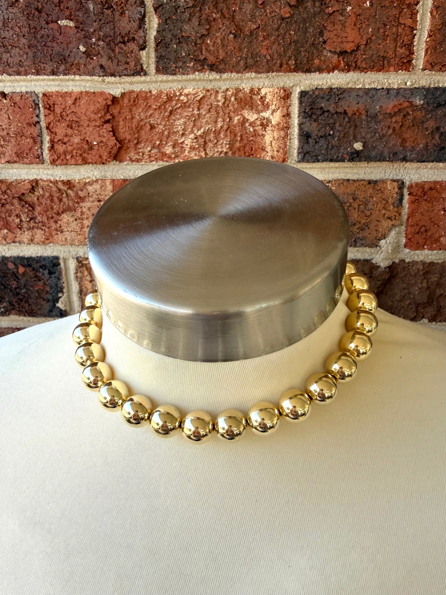 A big beaded multi strand choker length statement necklace made with shiny gold acrylic beads. This necklace is perfect for dressing up a casual outfit or wearing for a special occasion.
