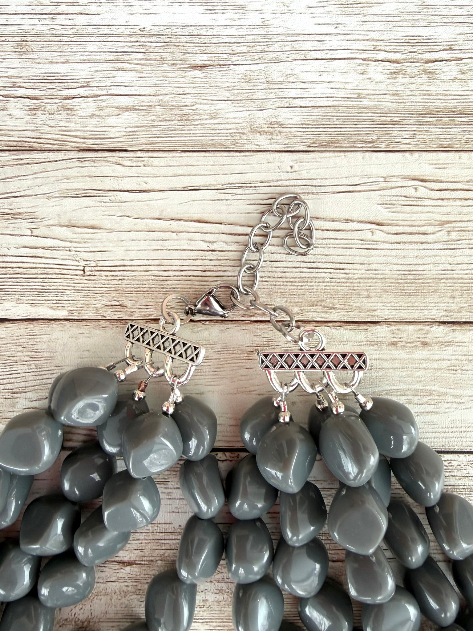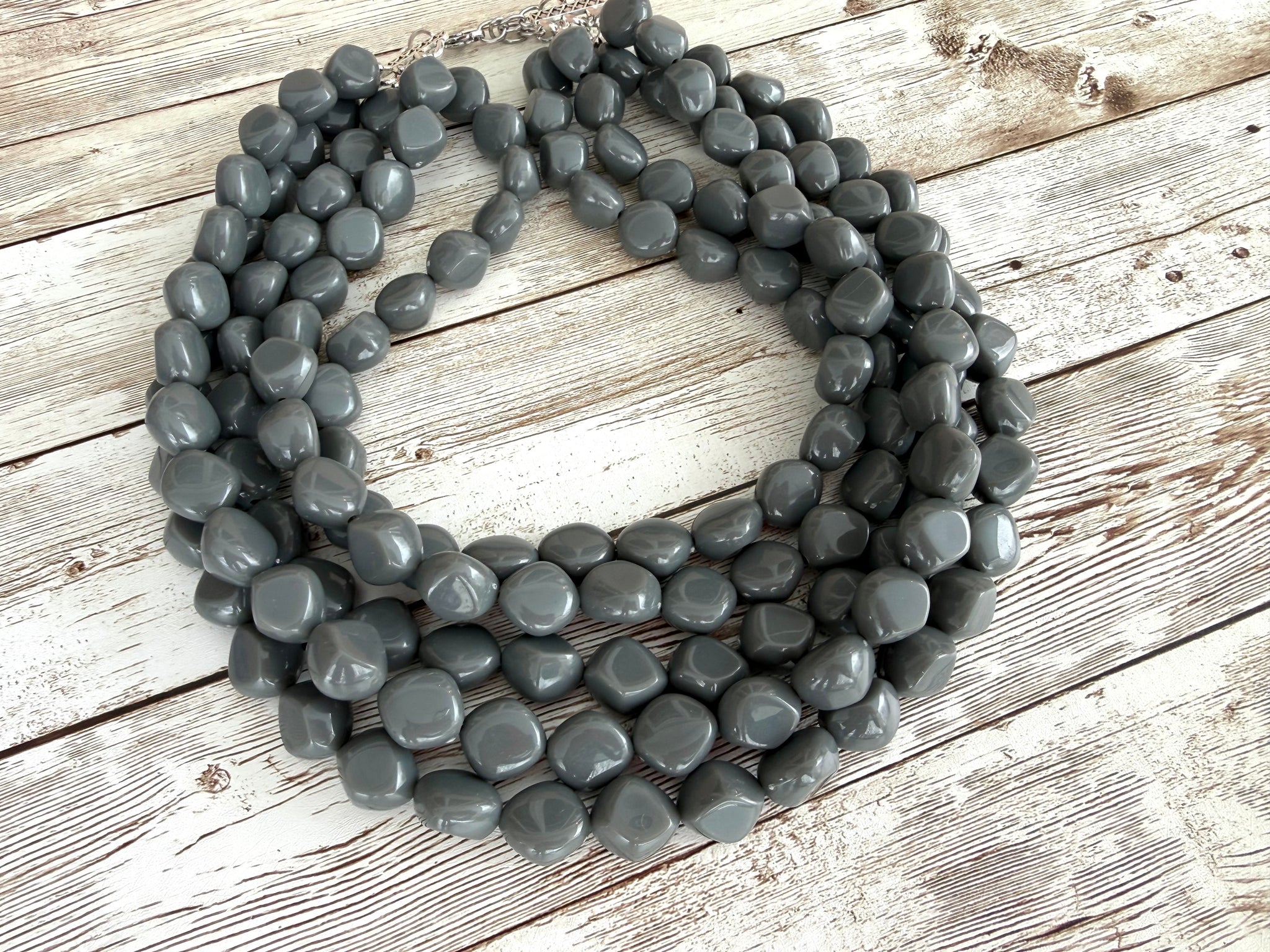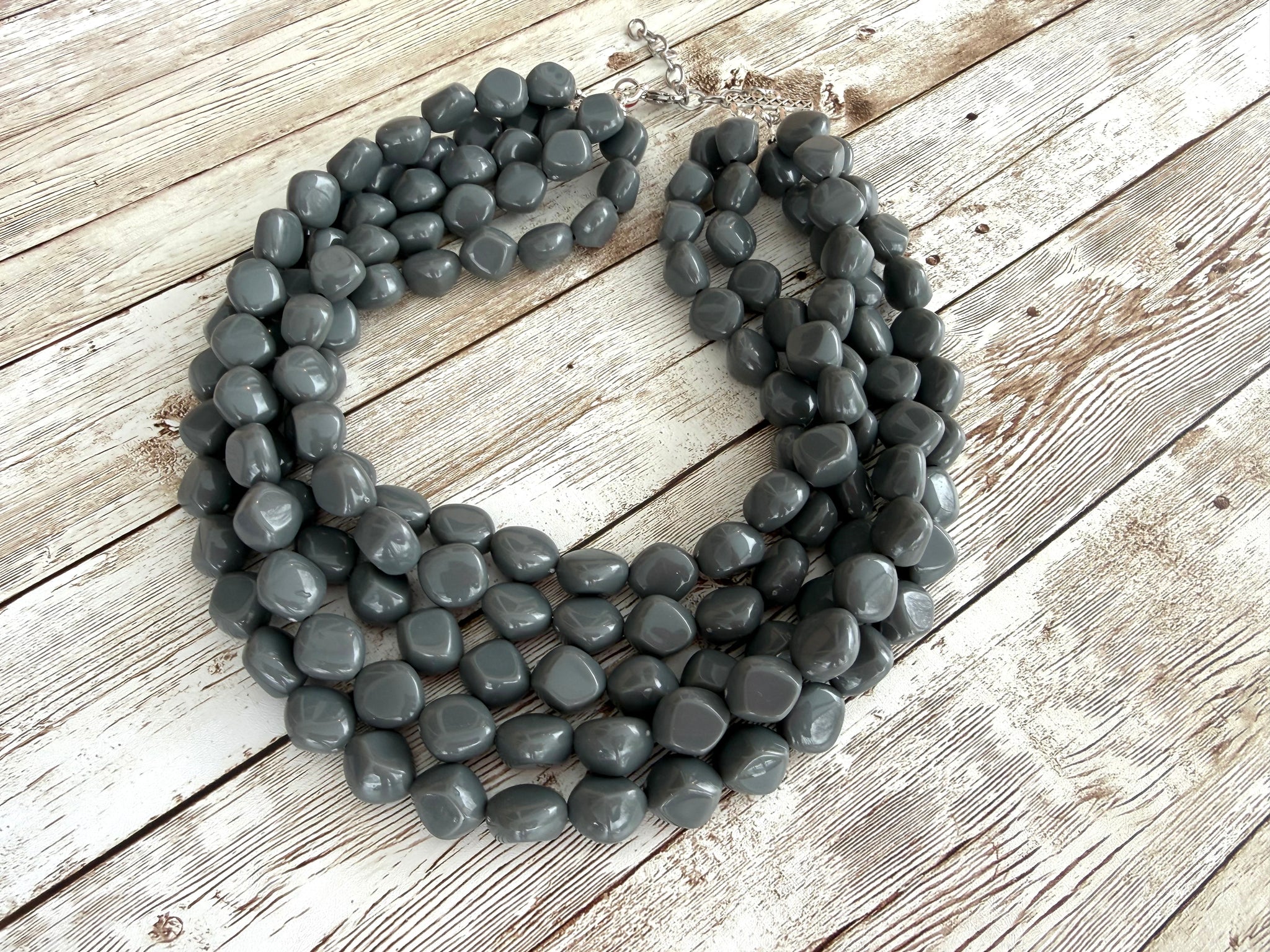 A chunky beaded multi strand statement necklace made with gray acrylic beads. This necklace is shown with 5 strands which has some weight to it.