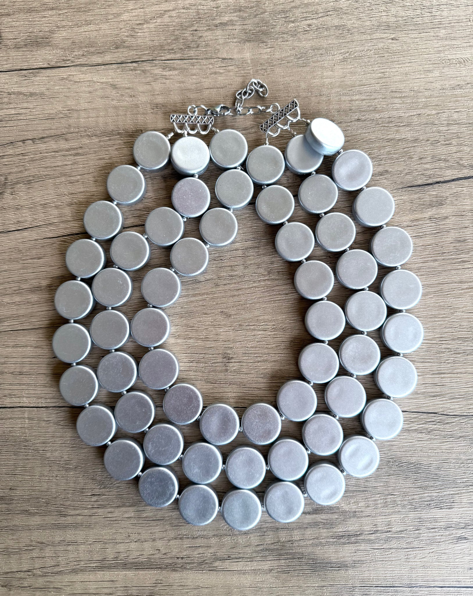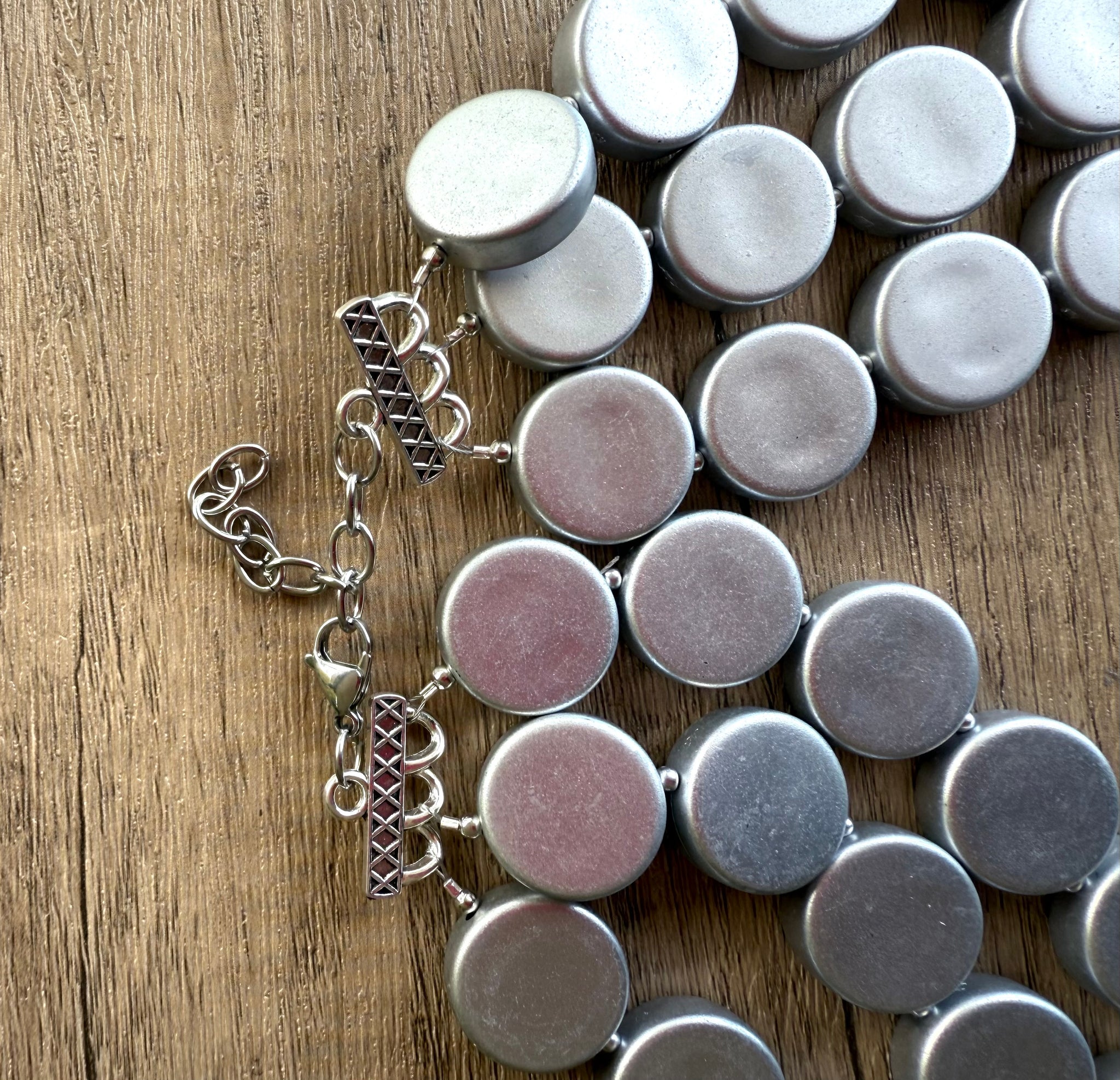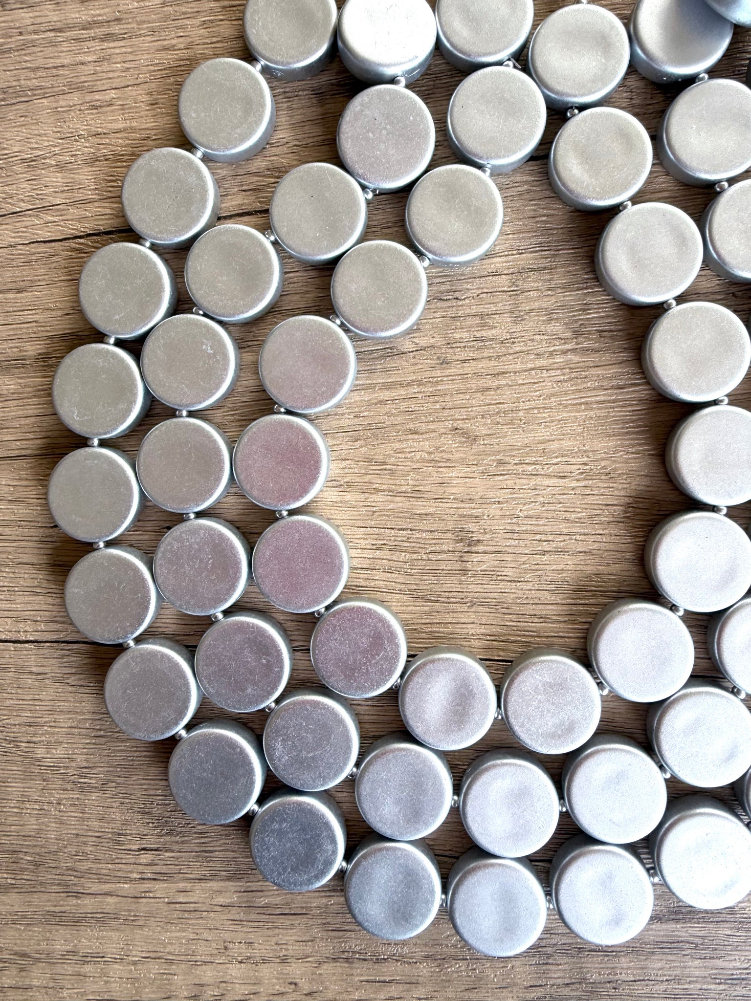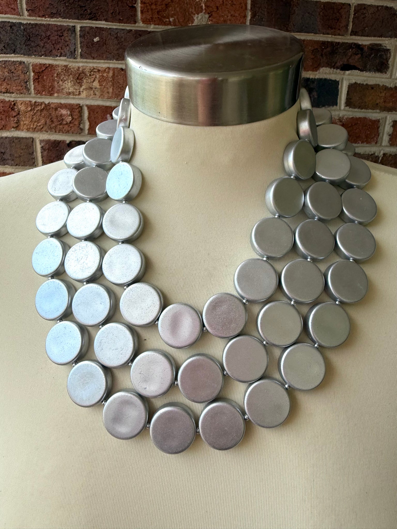 A beaded multi strand statement necklace made with silver coin shaped lucite and glass spacer beads.