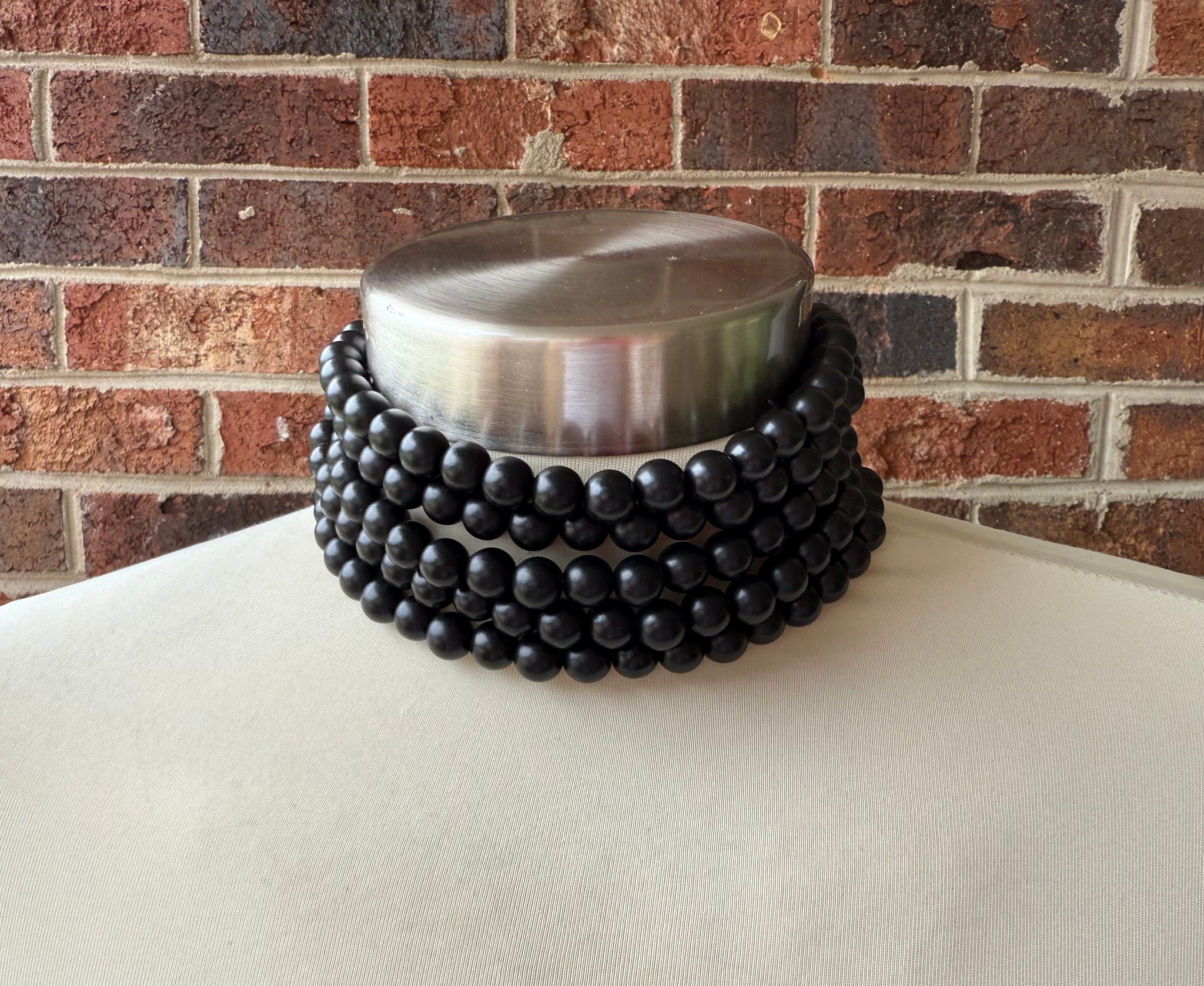 A lightweight beaded multi strand choker length statement necklace made with black matte acrylic beads. This necklace is perfect for dressing up a casual outfit or wearing for a special occasion.