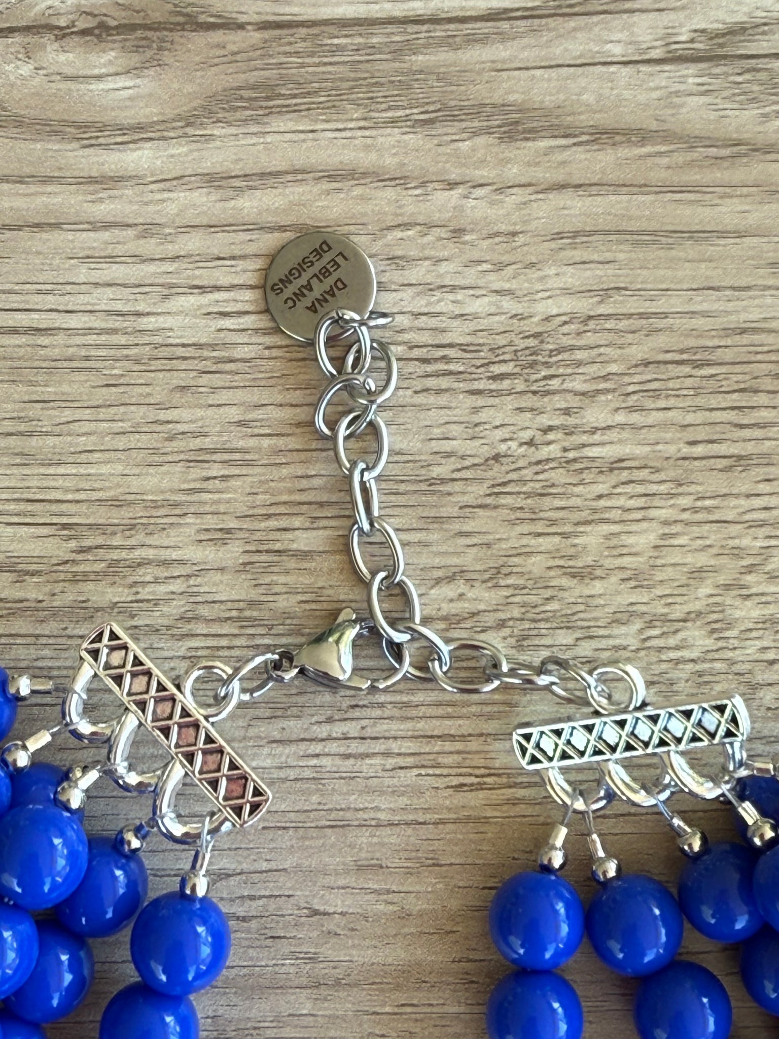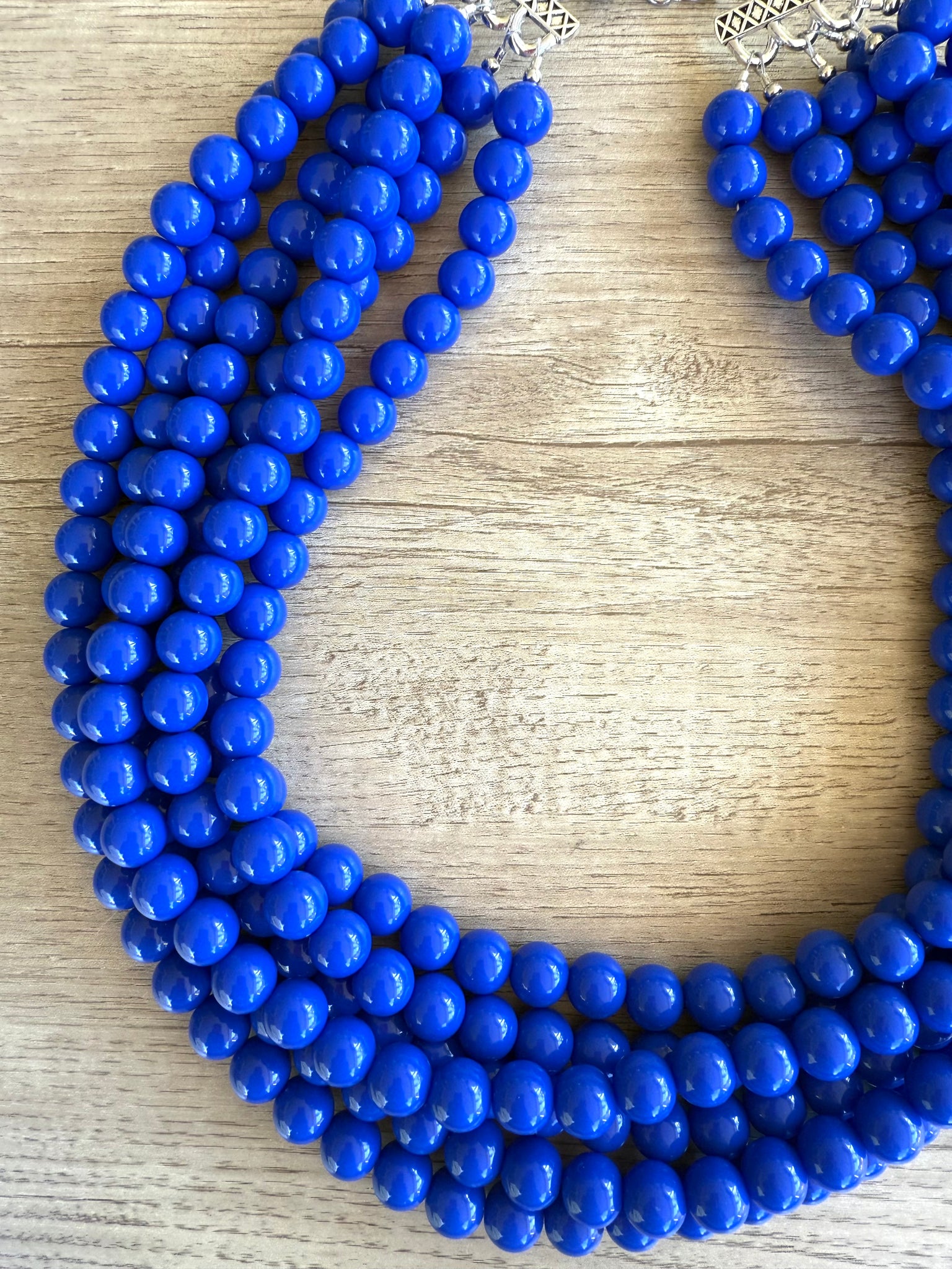 A bright beaded lightweight statement necklace made with cobalt blue acrylic beads.