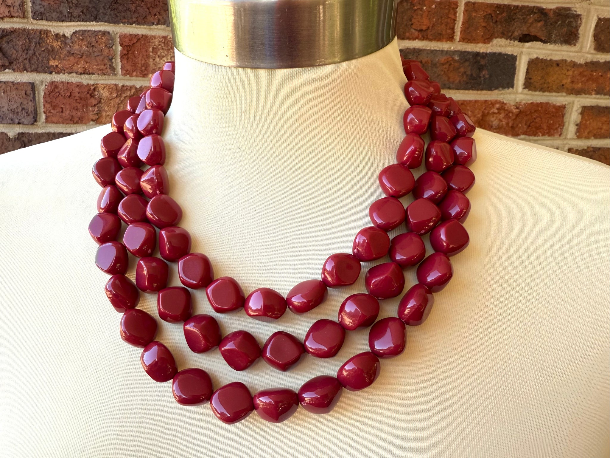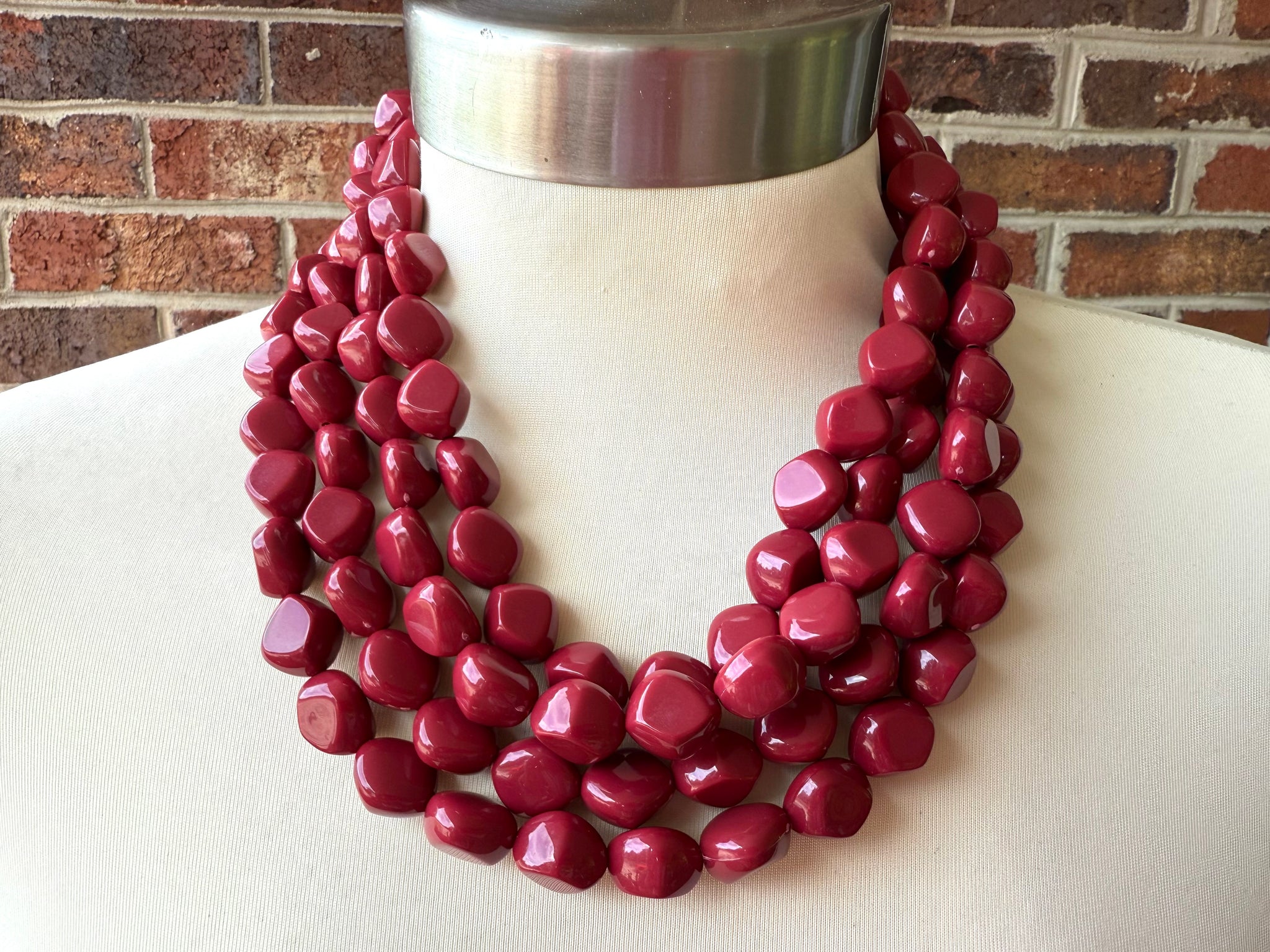 A chunky beaded multi strand statement necklace made with dark red lucite beads. This necklace is shown with 5 strands which has some weight to it.