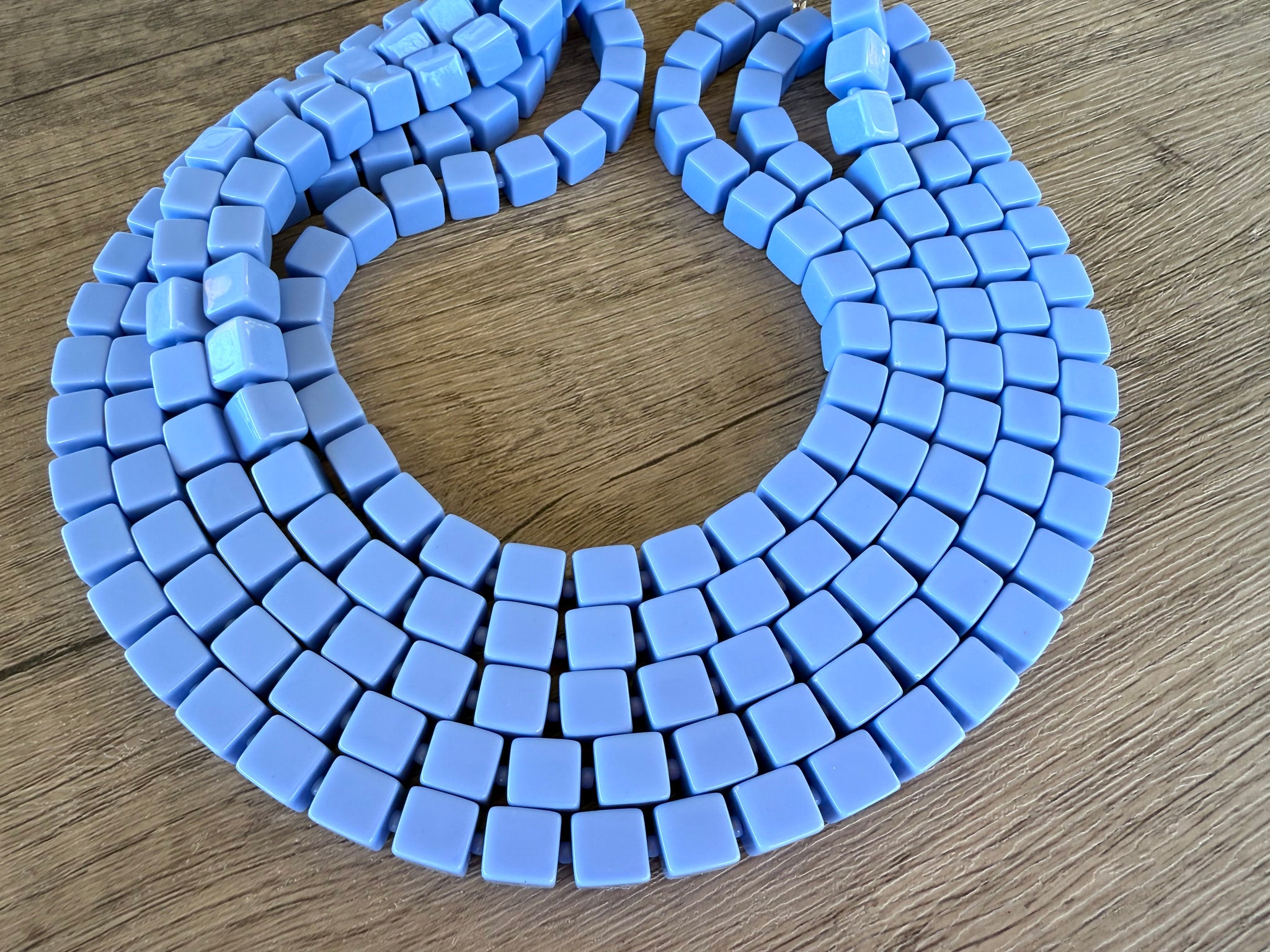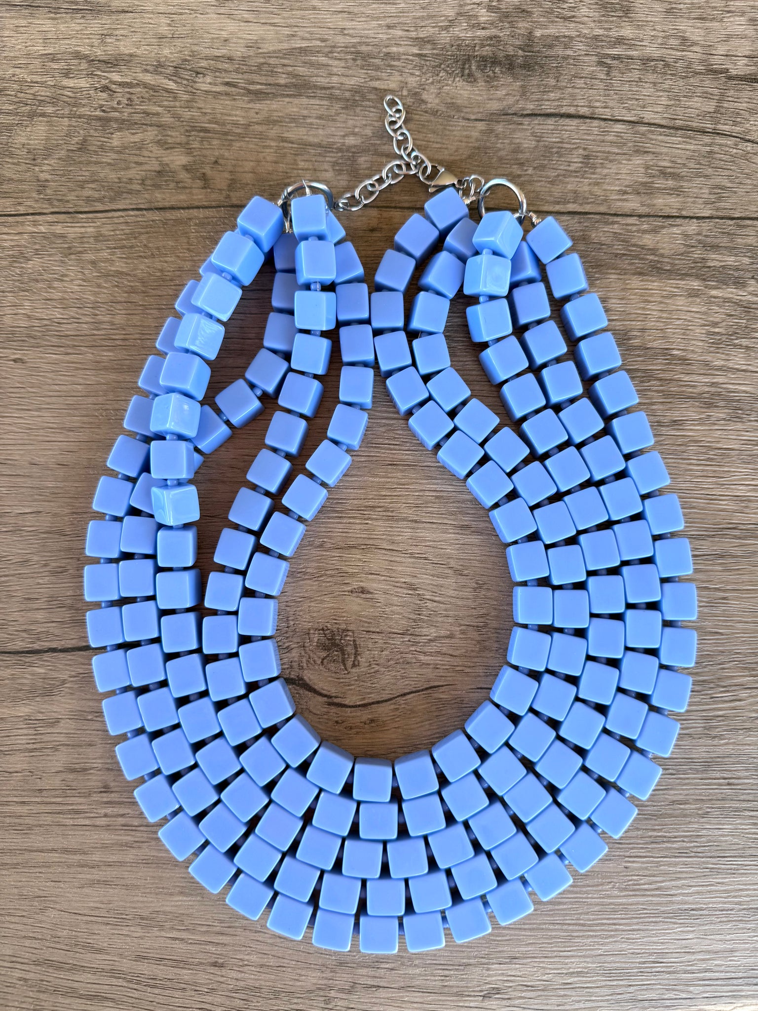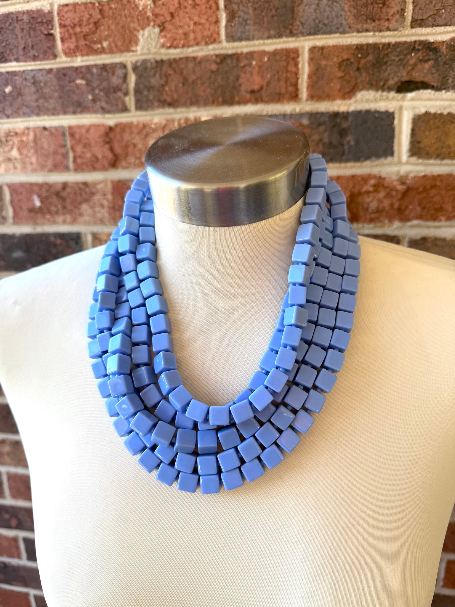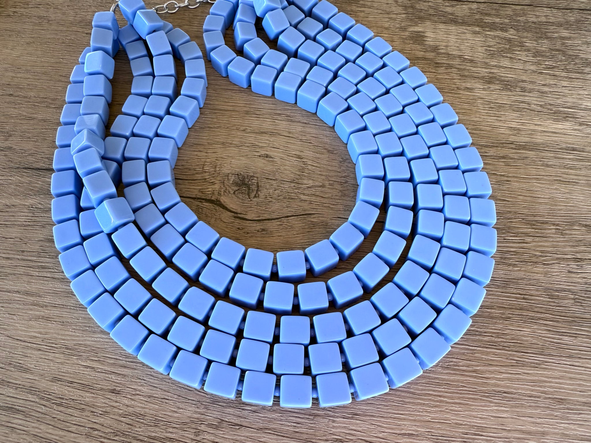 A chunky beaded multi strand statement necklace made with periwinkle blue cube acrylic beads and matching glass spacer beads. This necklace is shown with 5 strands, which has some weight to it.