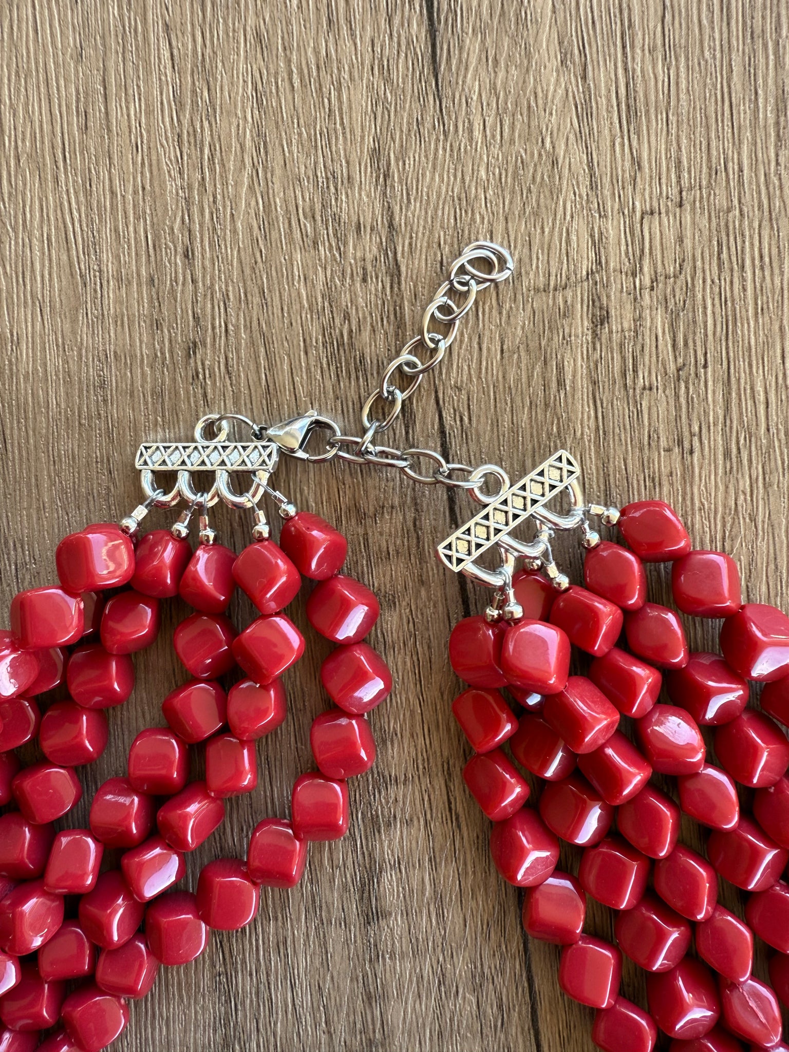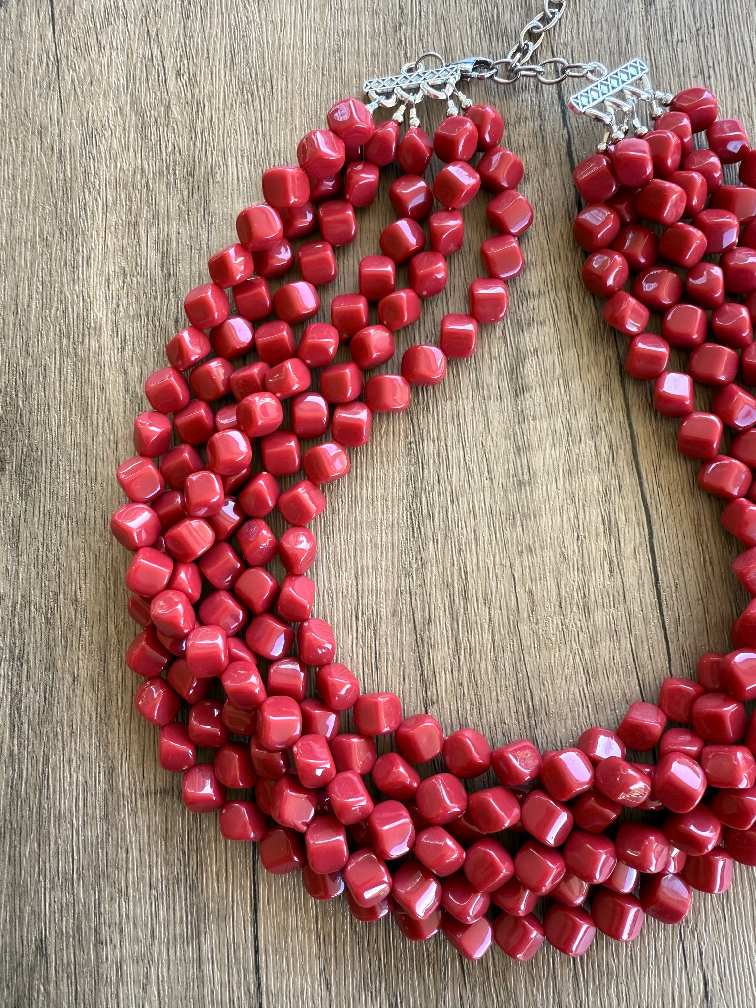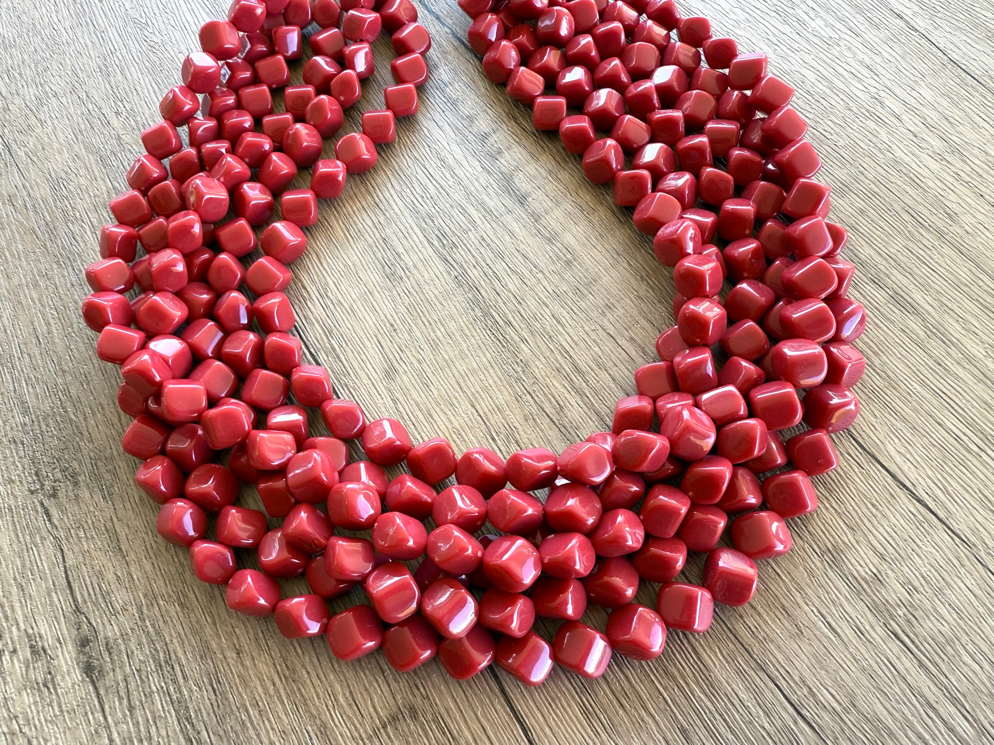 A beaded multi strand chunky statement necklace made with warm red acrylic beads.  The necklace is very lightweight.