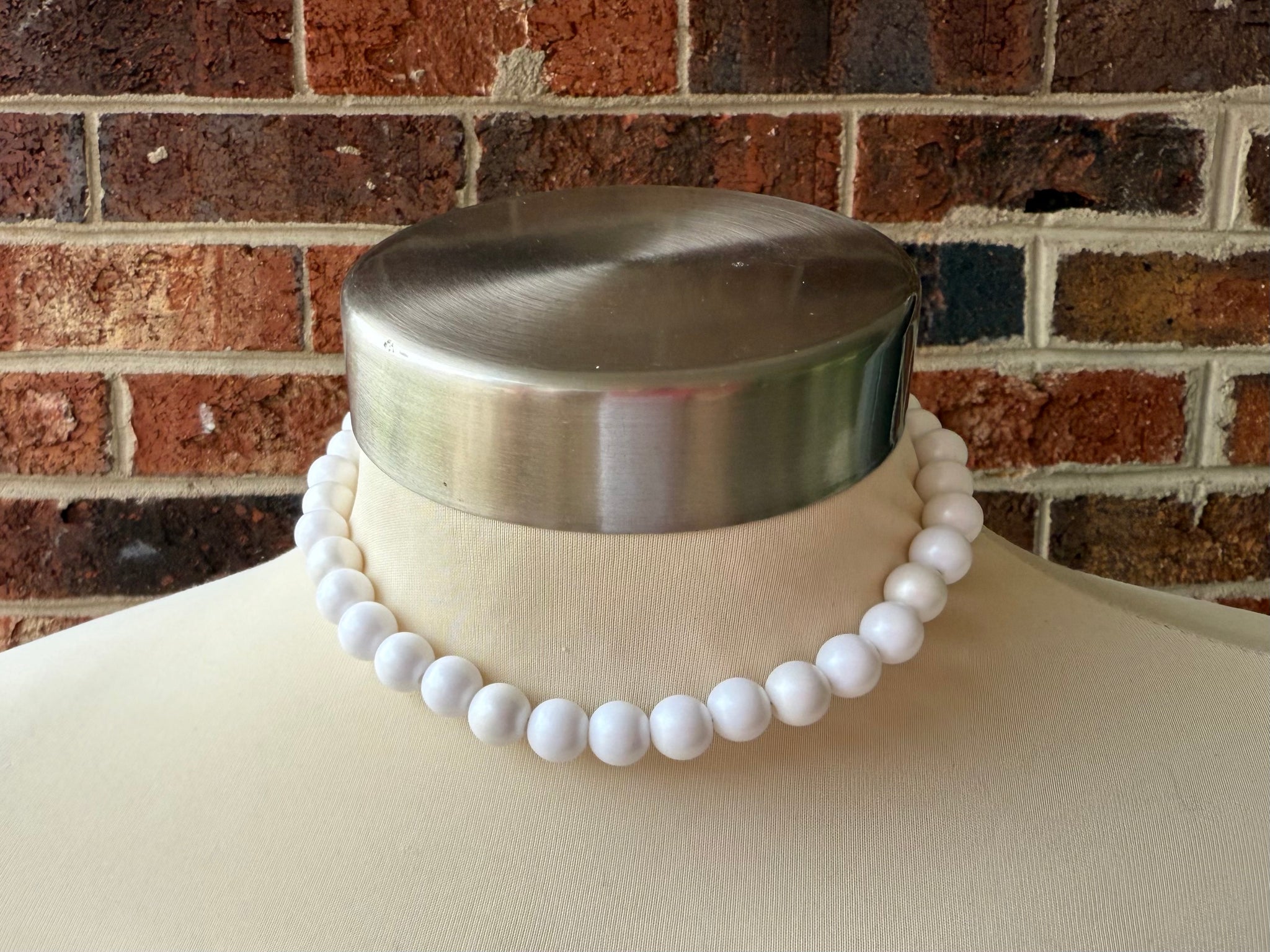A lightweight beaded multi strand choker length statement necklace made with white pearlescent round acrylic beads. This necklace is perfect for dressing up a casual outfit or wearing for a special occasion.