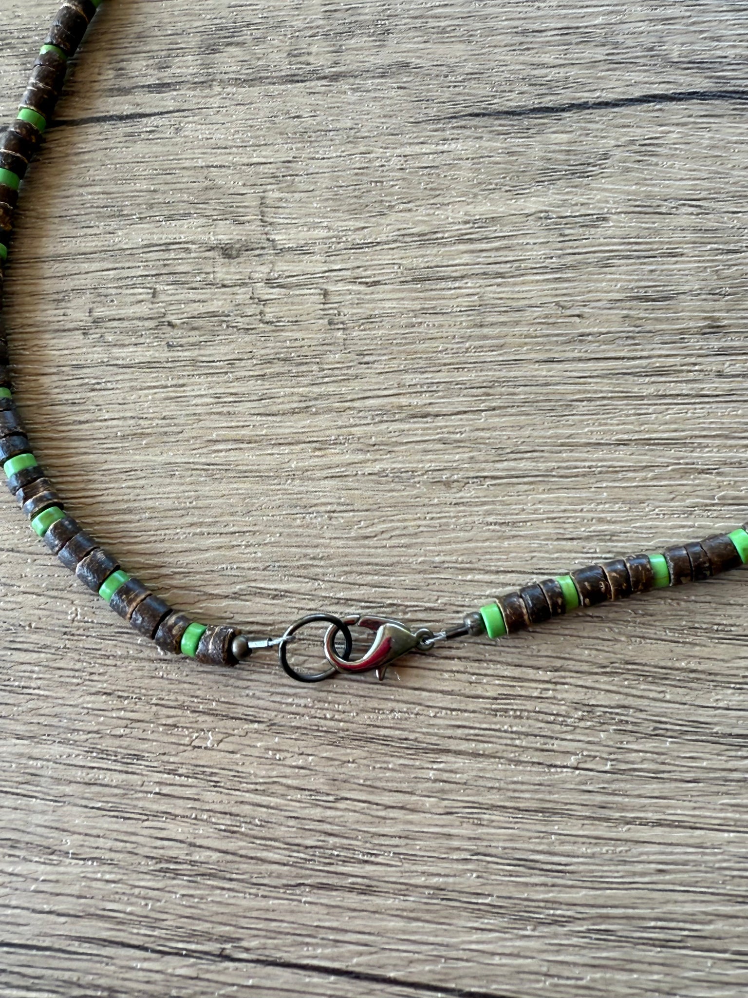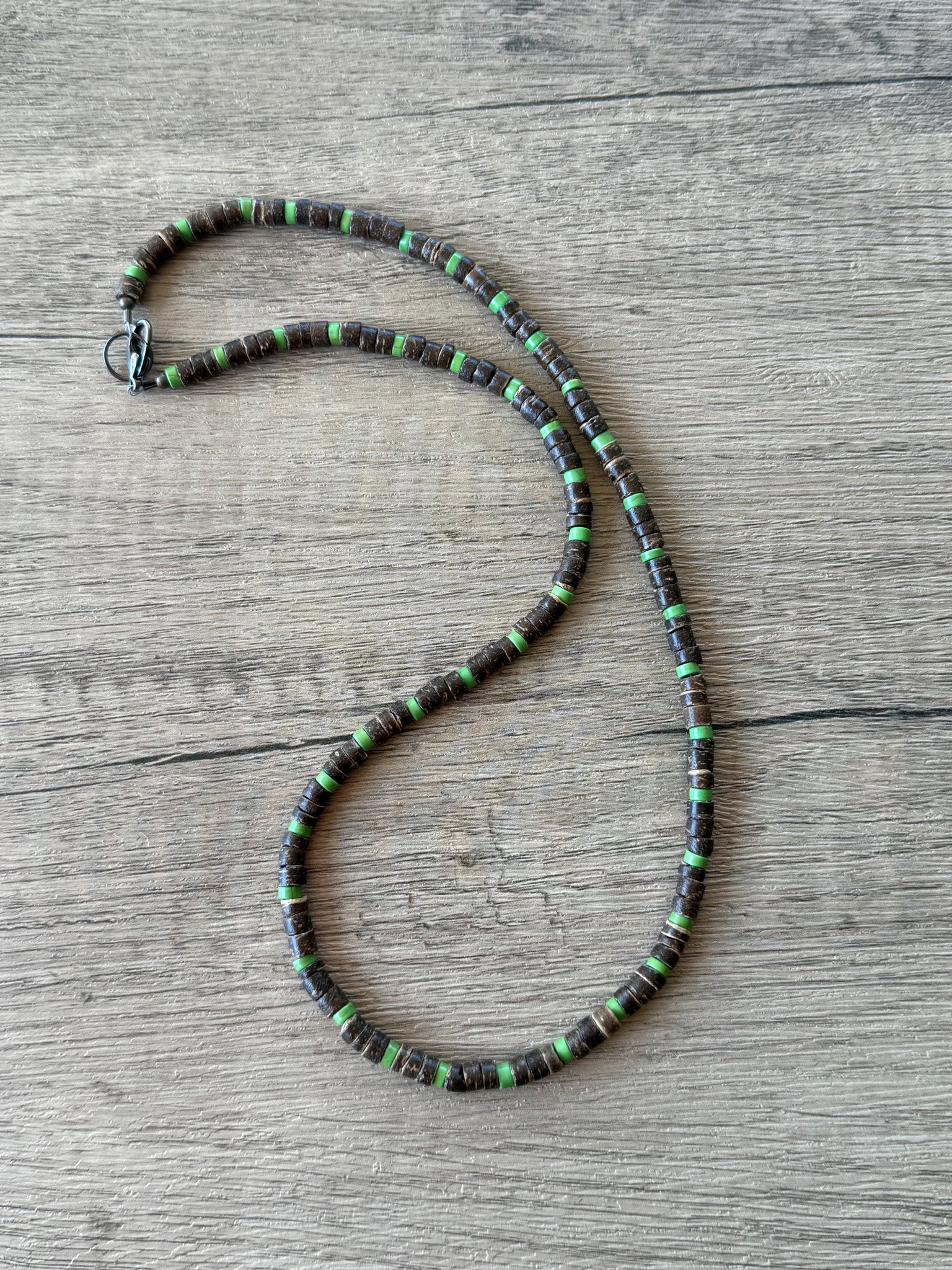 A lightweight beaded mens necklace made with brown coconut wood and green magnesite stone rondelle beads.