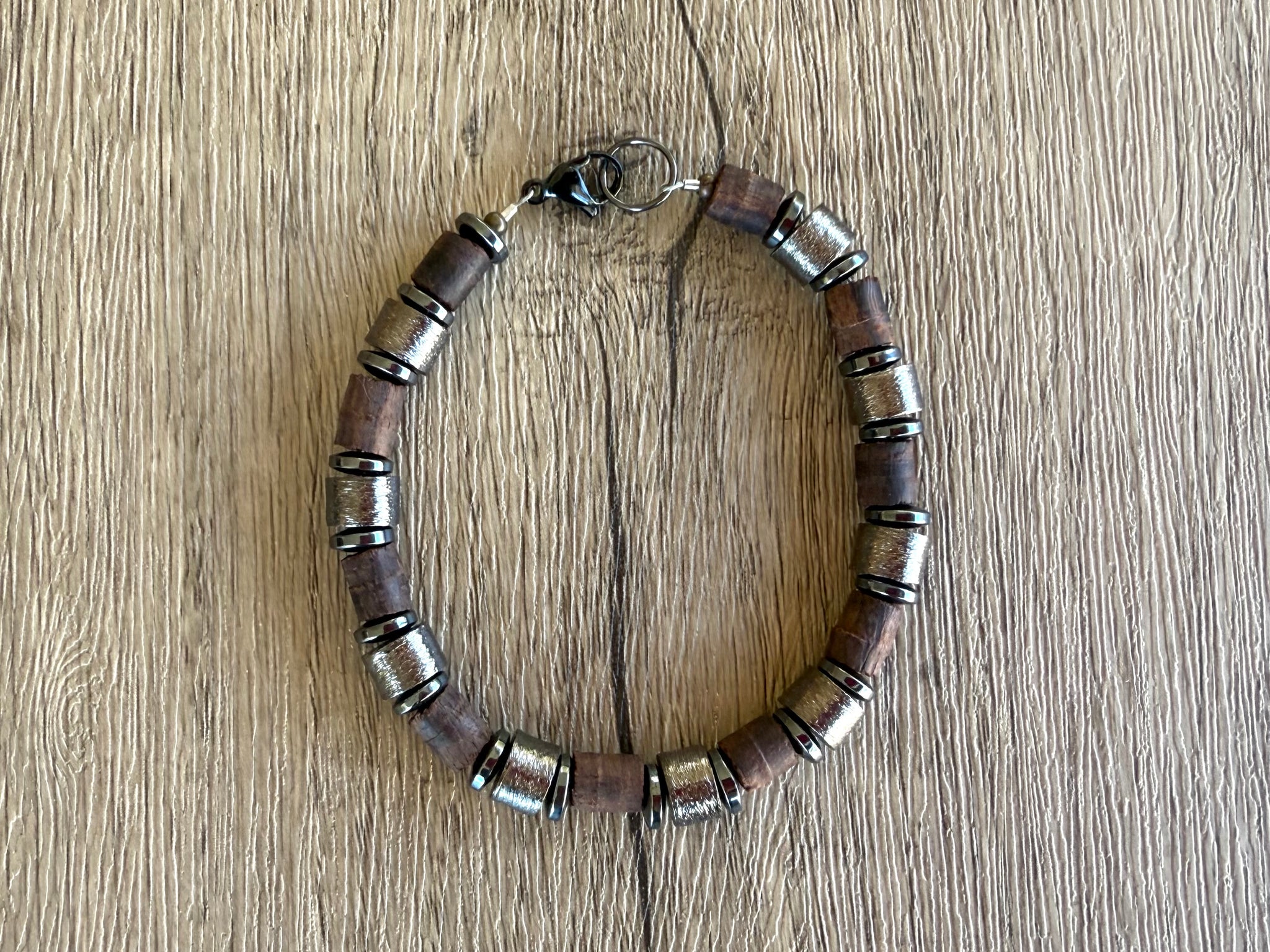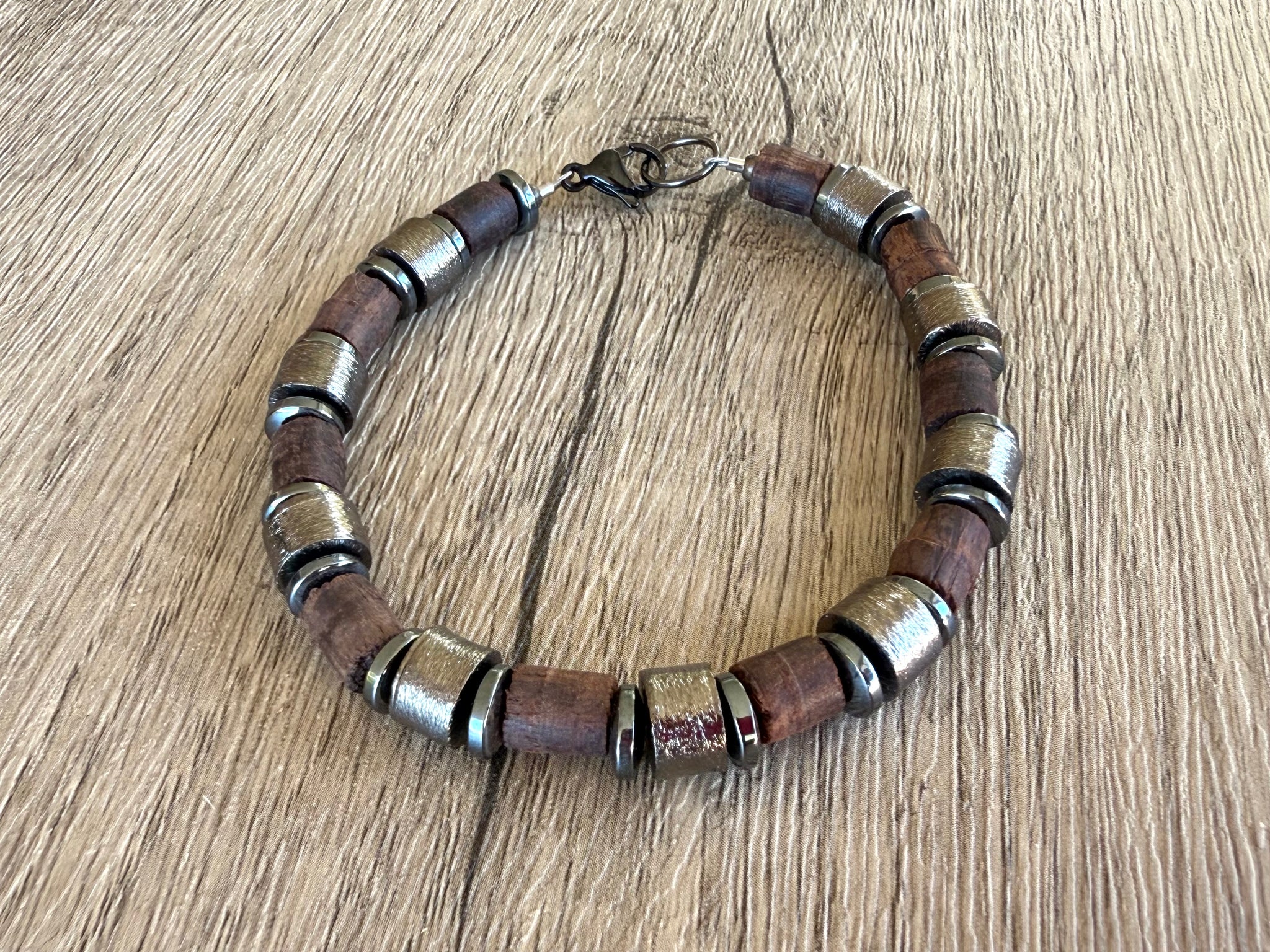 A beaded mens bracelet made with hematite, wood and gunmetal plated beads.