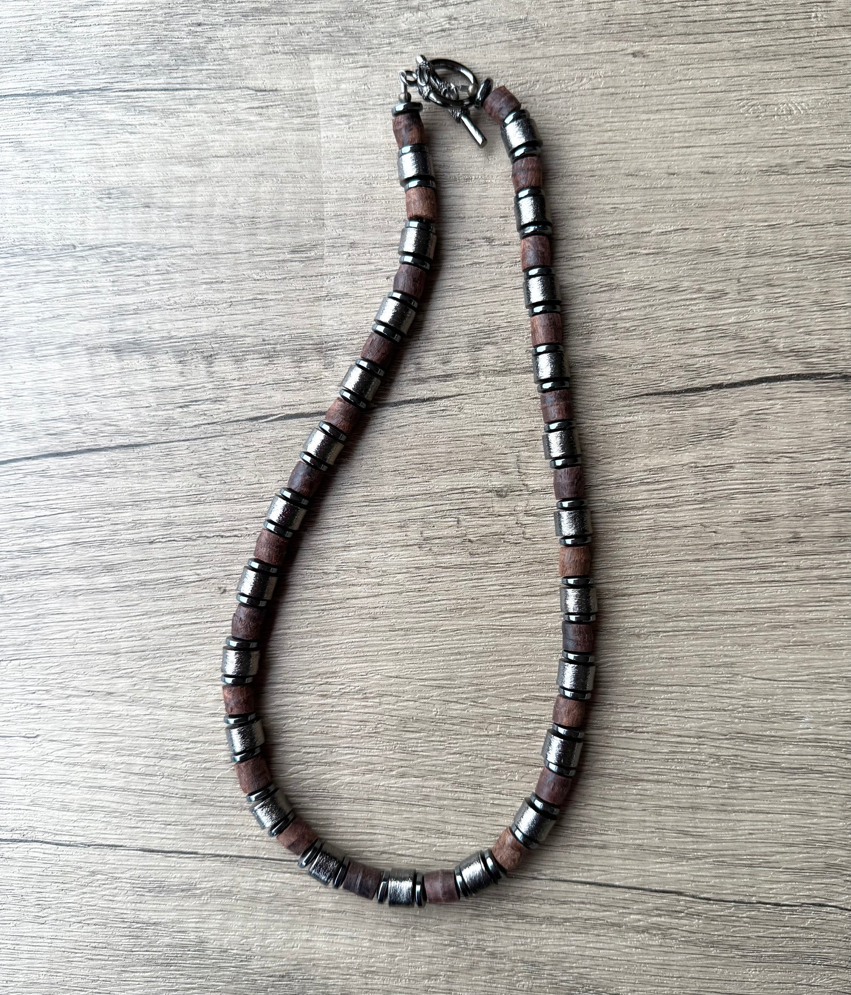 A matching necklace is also available. https://www.danaleblanc.com/products/copper-mens-necklace-beaded-wood-necklace-man-necklace-gifts-for-men-alphonso?_pos=2&_sid=e6a1e6ec9&_ss=r