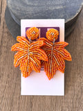 Fun and lightweight beaded orange leaves earrings made with orange glass beads sewn on a felt back. The back of the post is made of felt and zinc alloy posts.