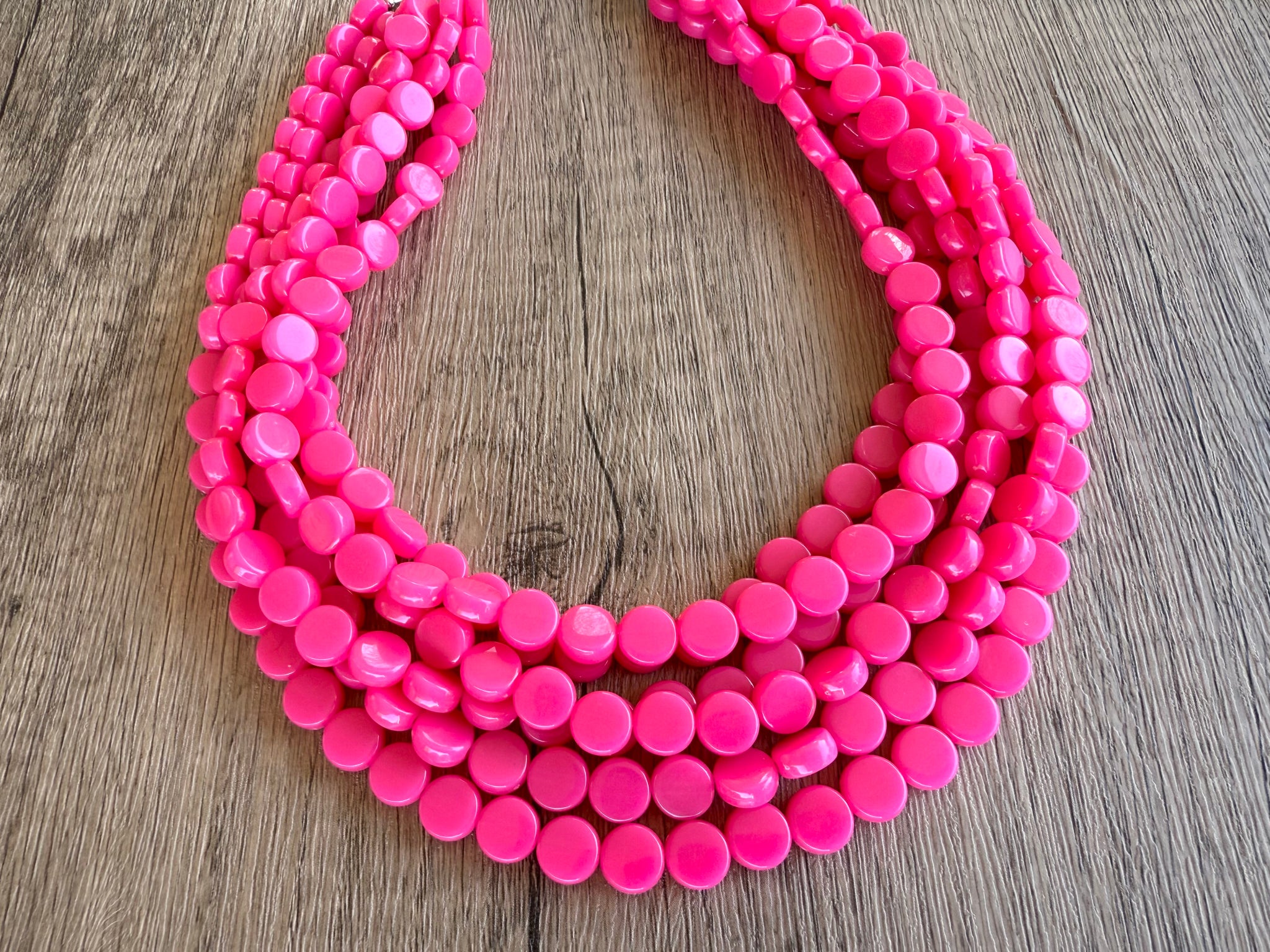A fun and bright statement necklace made with hot pink acrylic flat coin shaped beads.