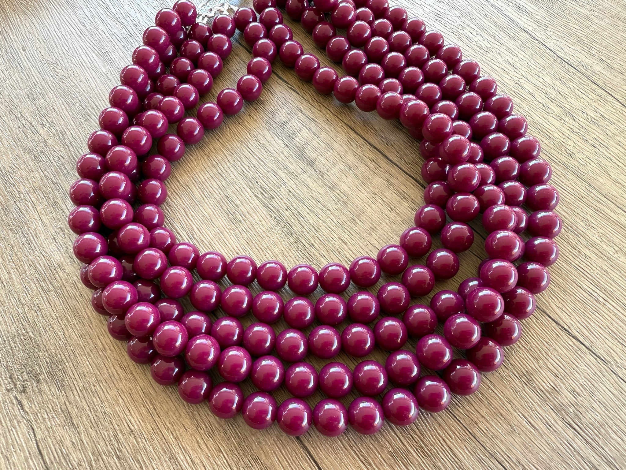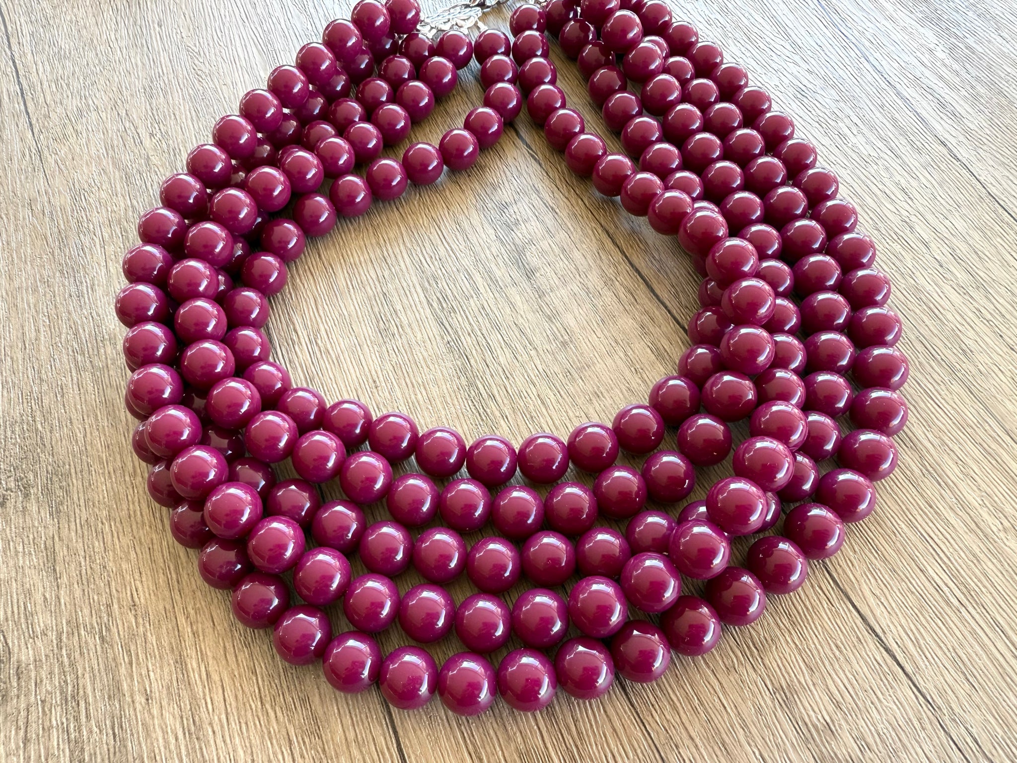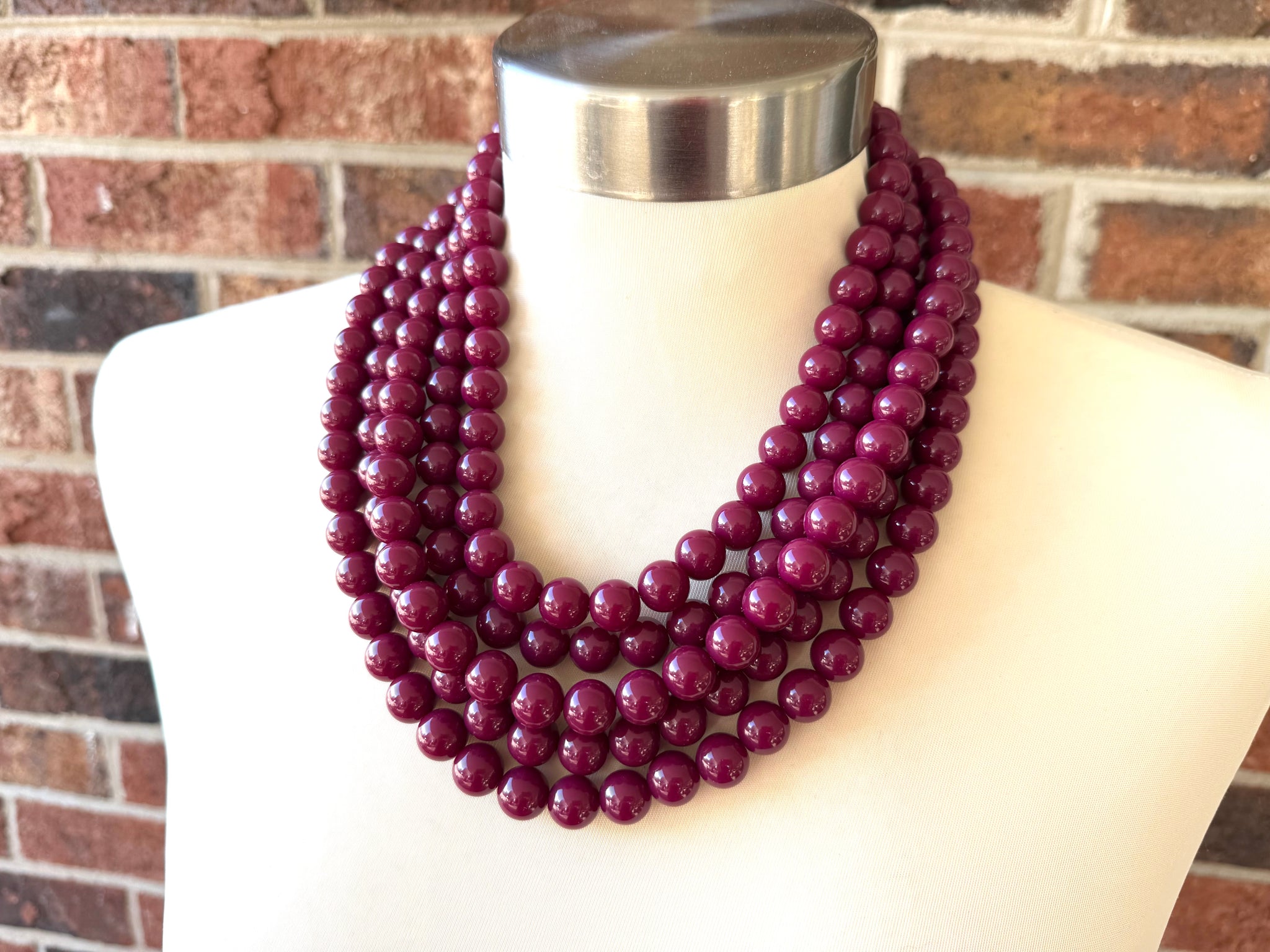 A big 12mm beaded multi strand statement necklace made with dark red acrylic beads. The necklace has some weight to it in the 5 and 6 strand versions.