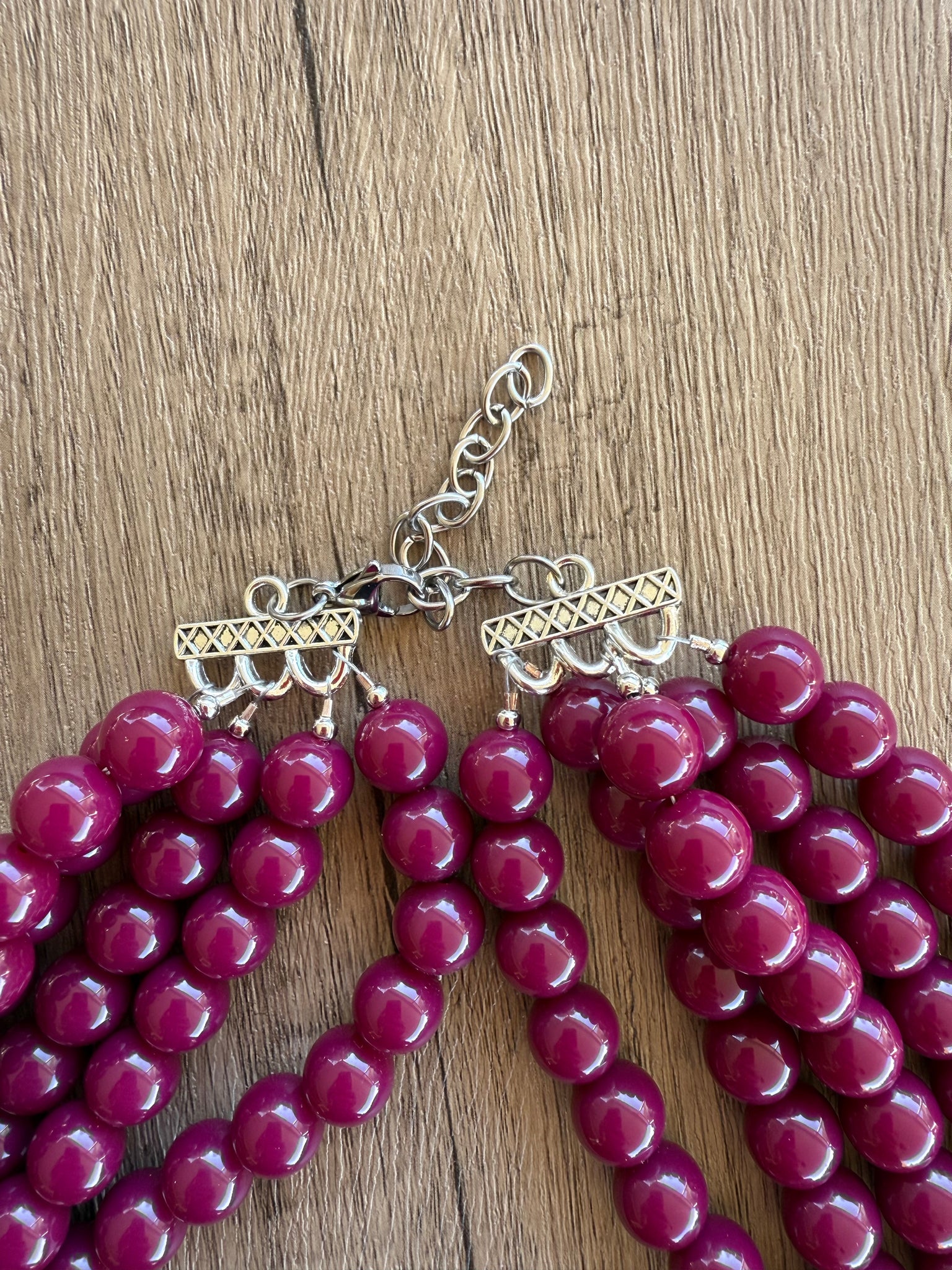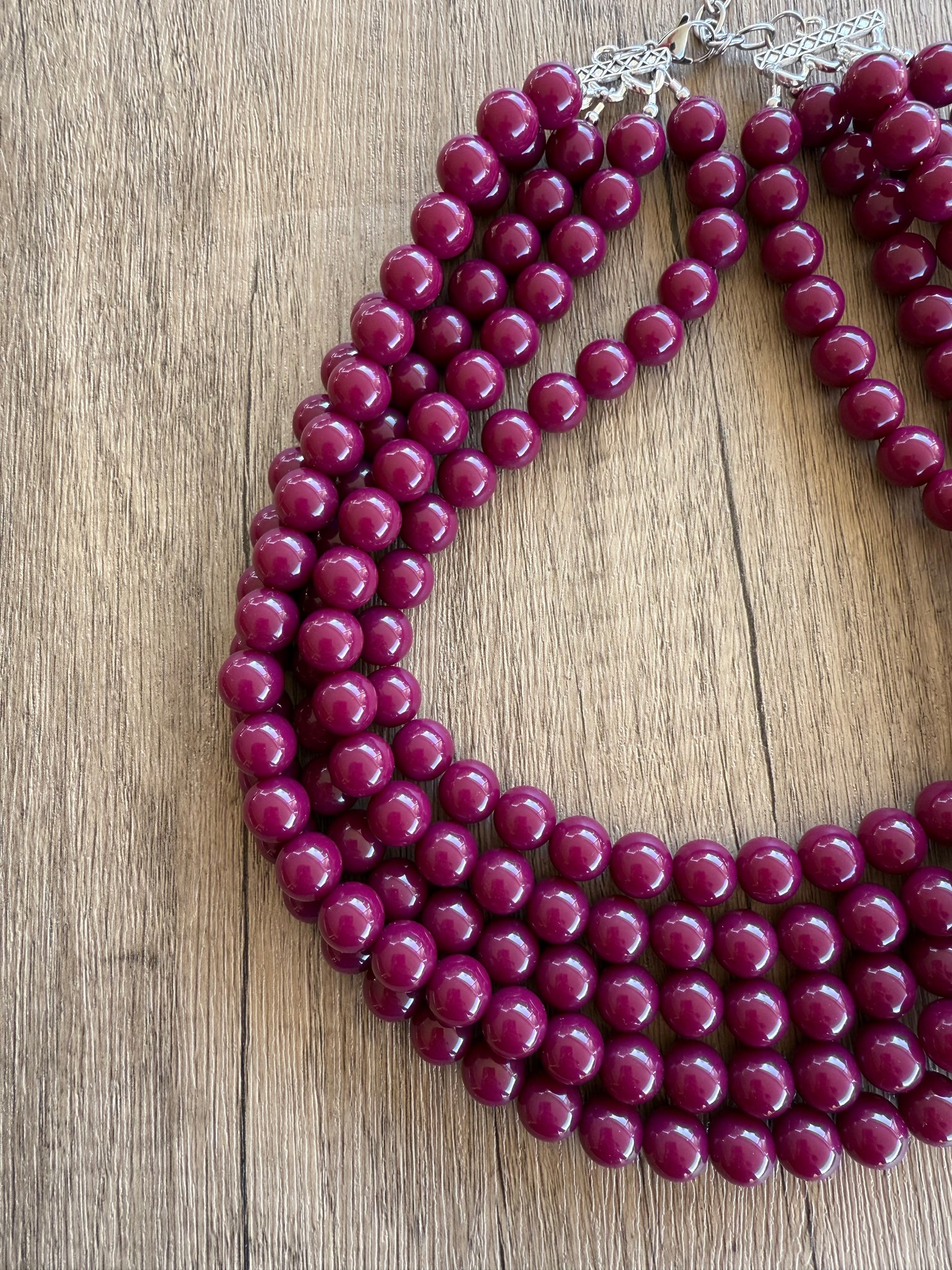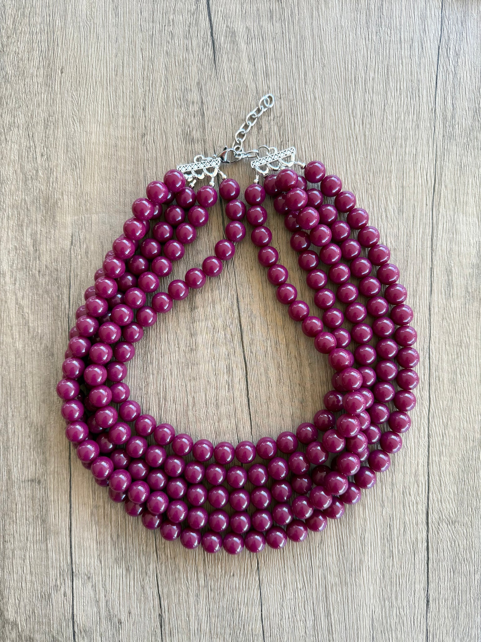 A big 12mm beaded multi strand statement necklace made with dark red acrylic beads. The necklace has some weight to it in the 5 and 6 strand versions.
