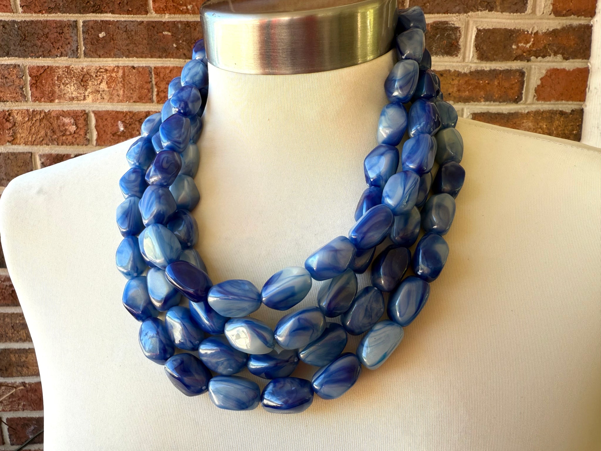 A beautiful chunky beaded multi strand statement necklace made with vintage style blue and off white swirl lucite beads. The necklace has some weight to it.