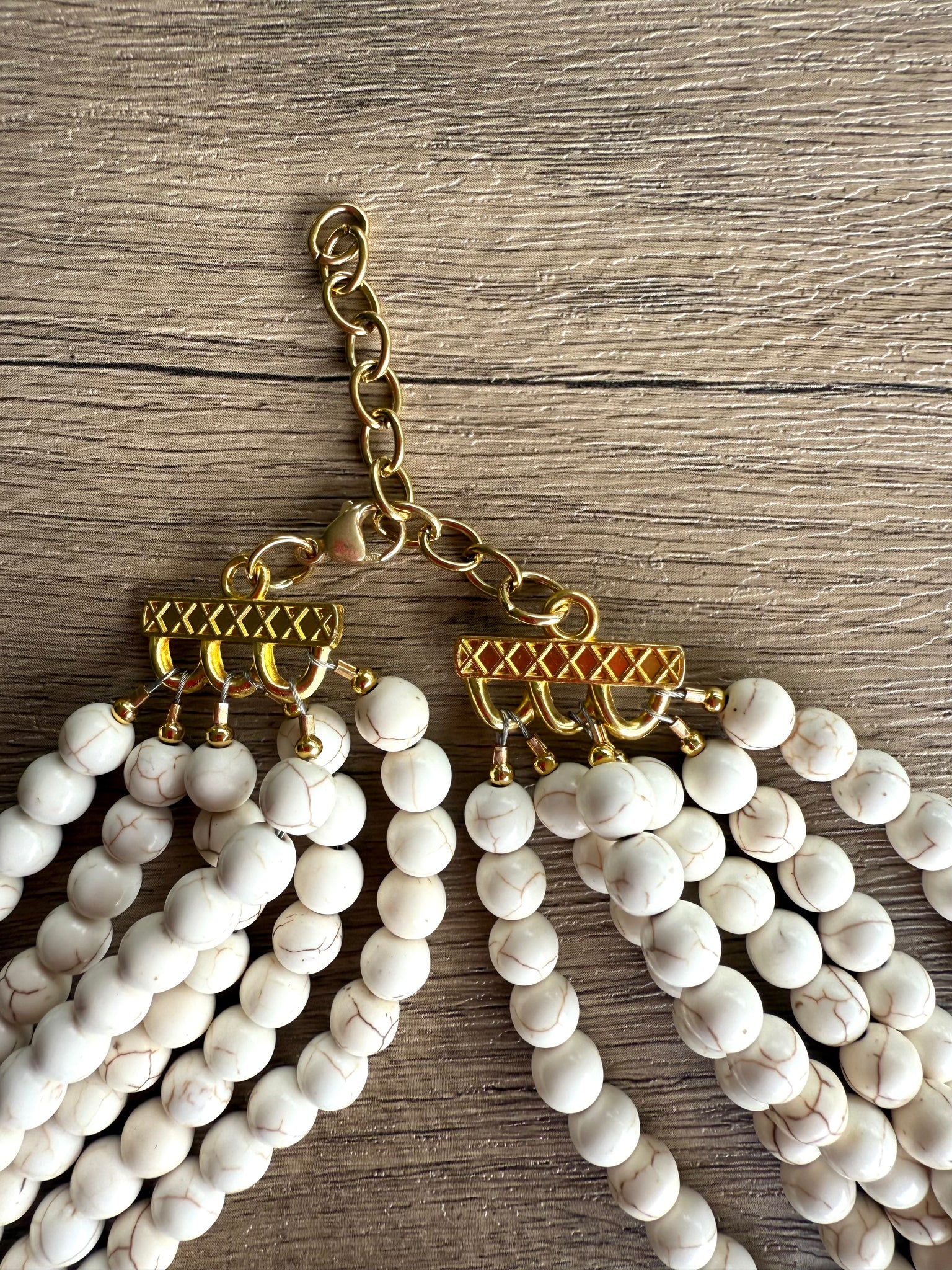 A beaded multi layer statement necklace made with white and brown streaked magnesite beads. A versatile necklace to pair with many outfits.