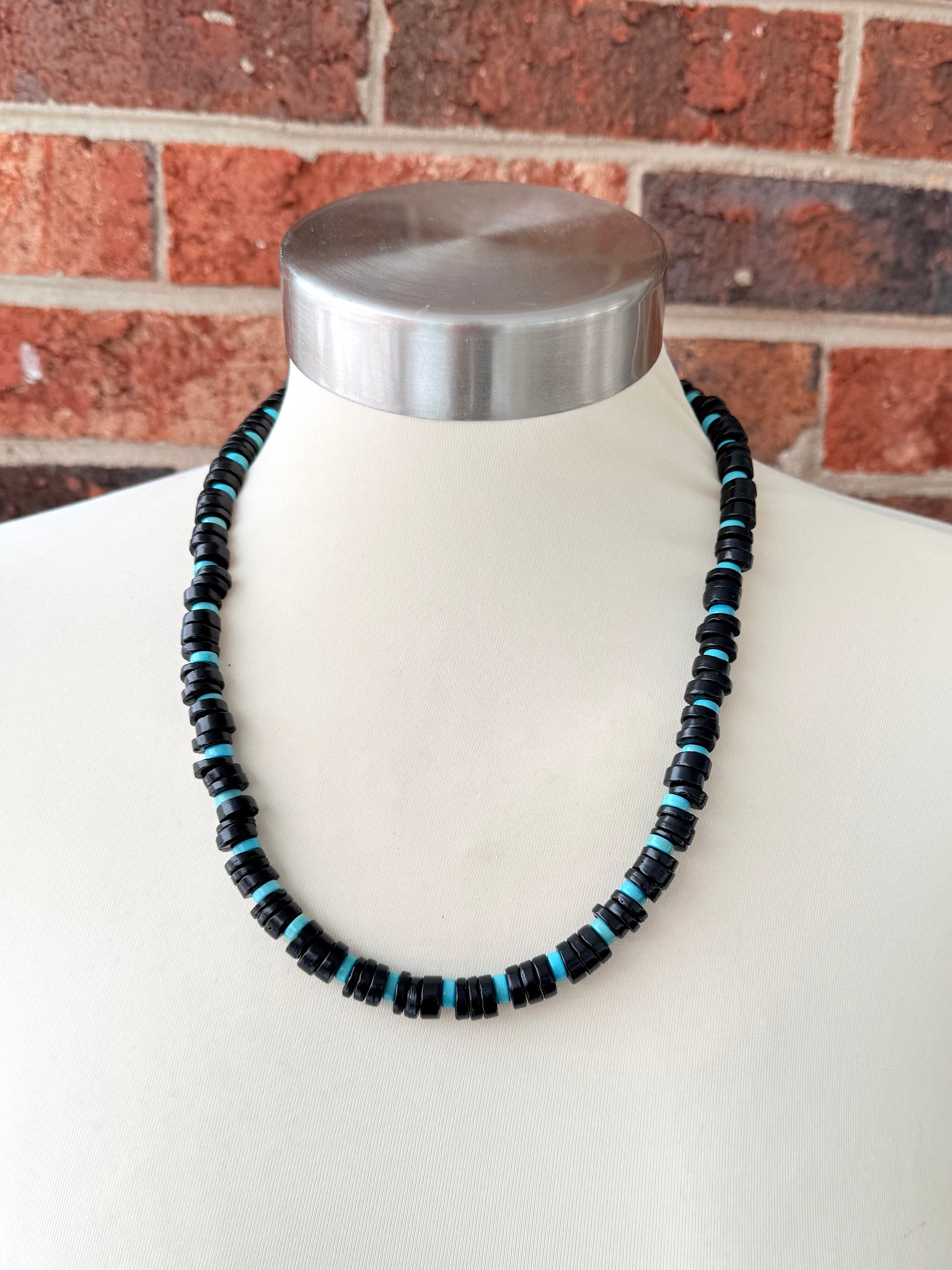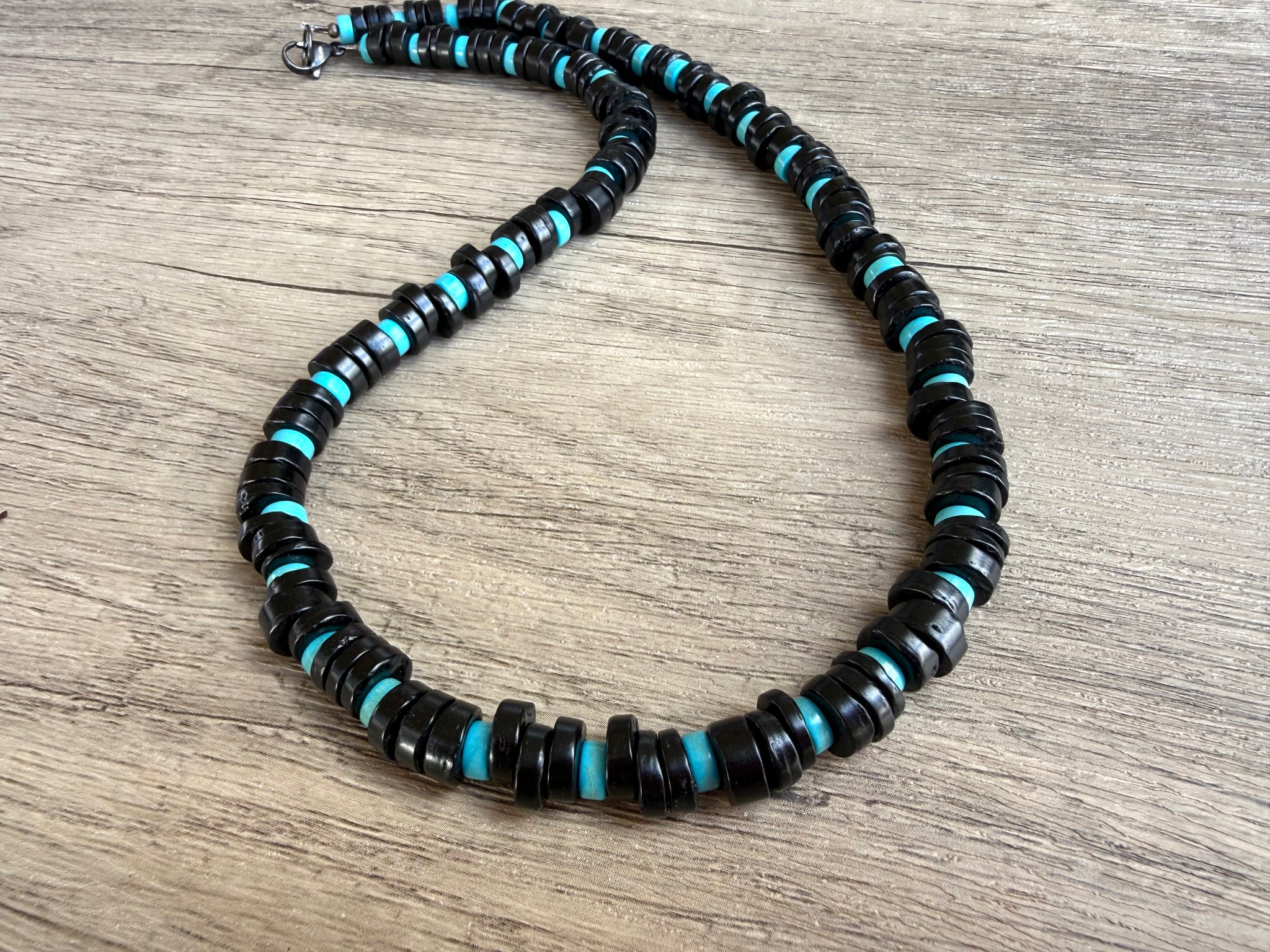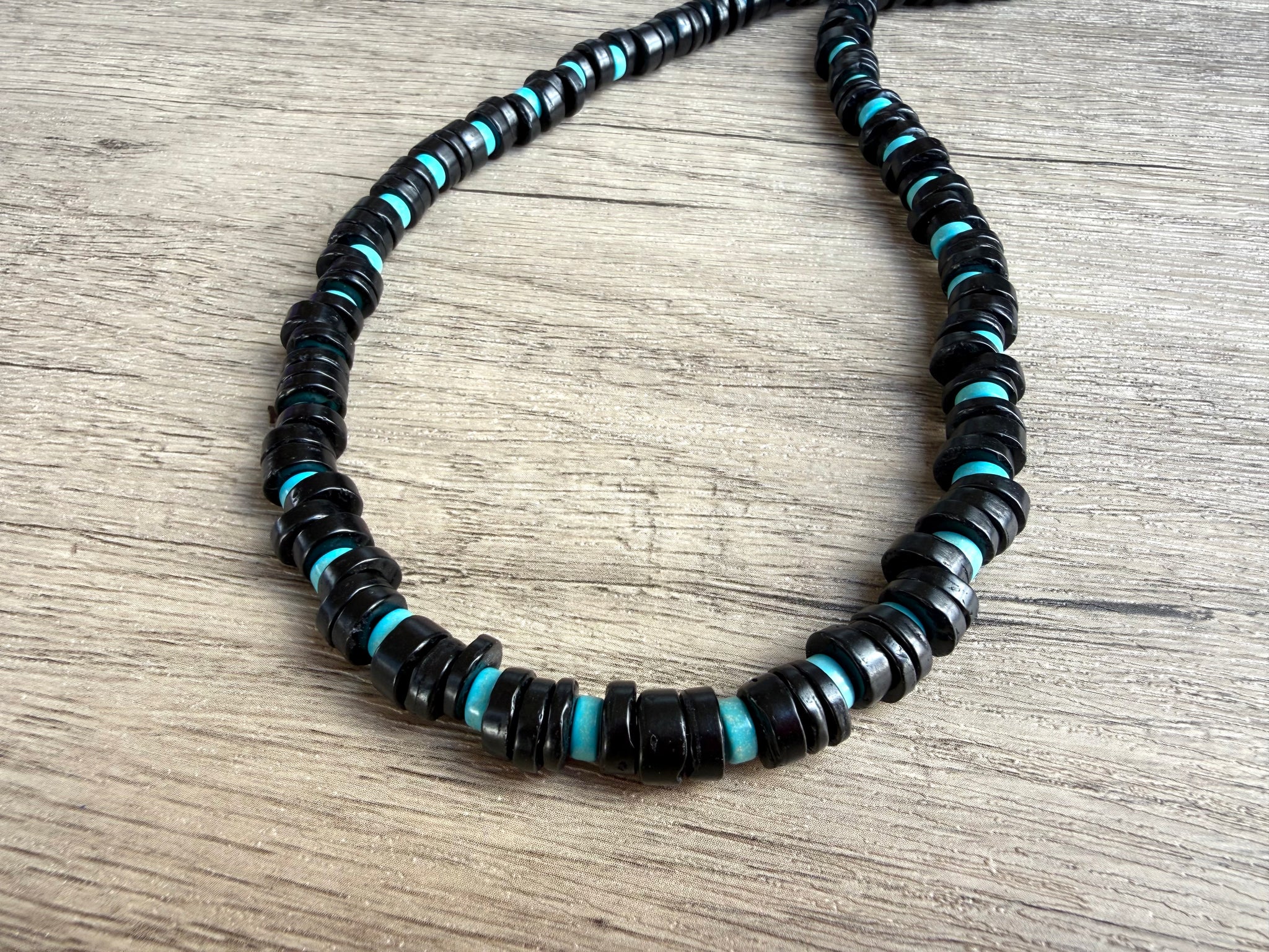 A beaded mens necklace made with black coconut wood and turquoise magnesite.