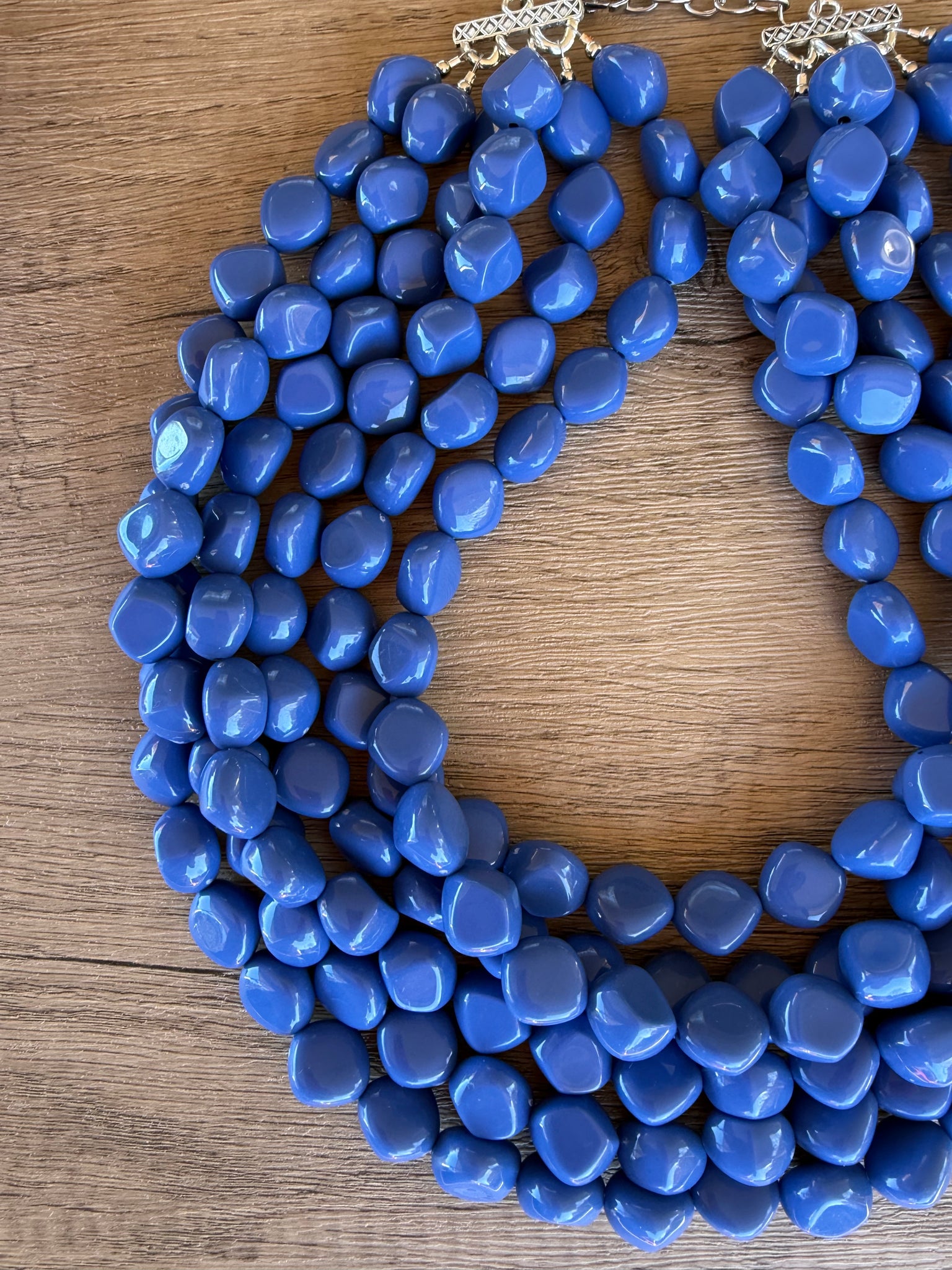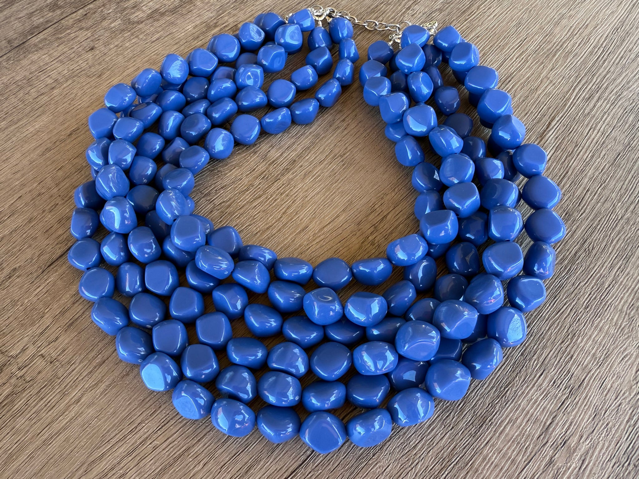 A chunky beaded multi strand statement necklace made with cobalt blue lucite beads. This necklace is shown with 6 strands, which has some weight to it.