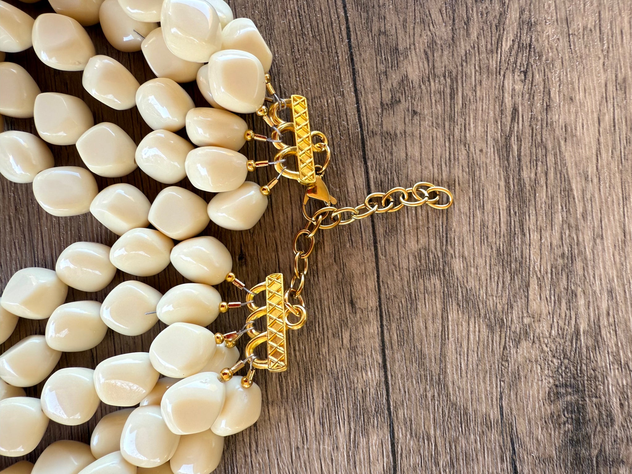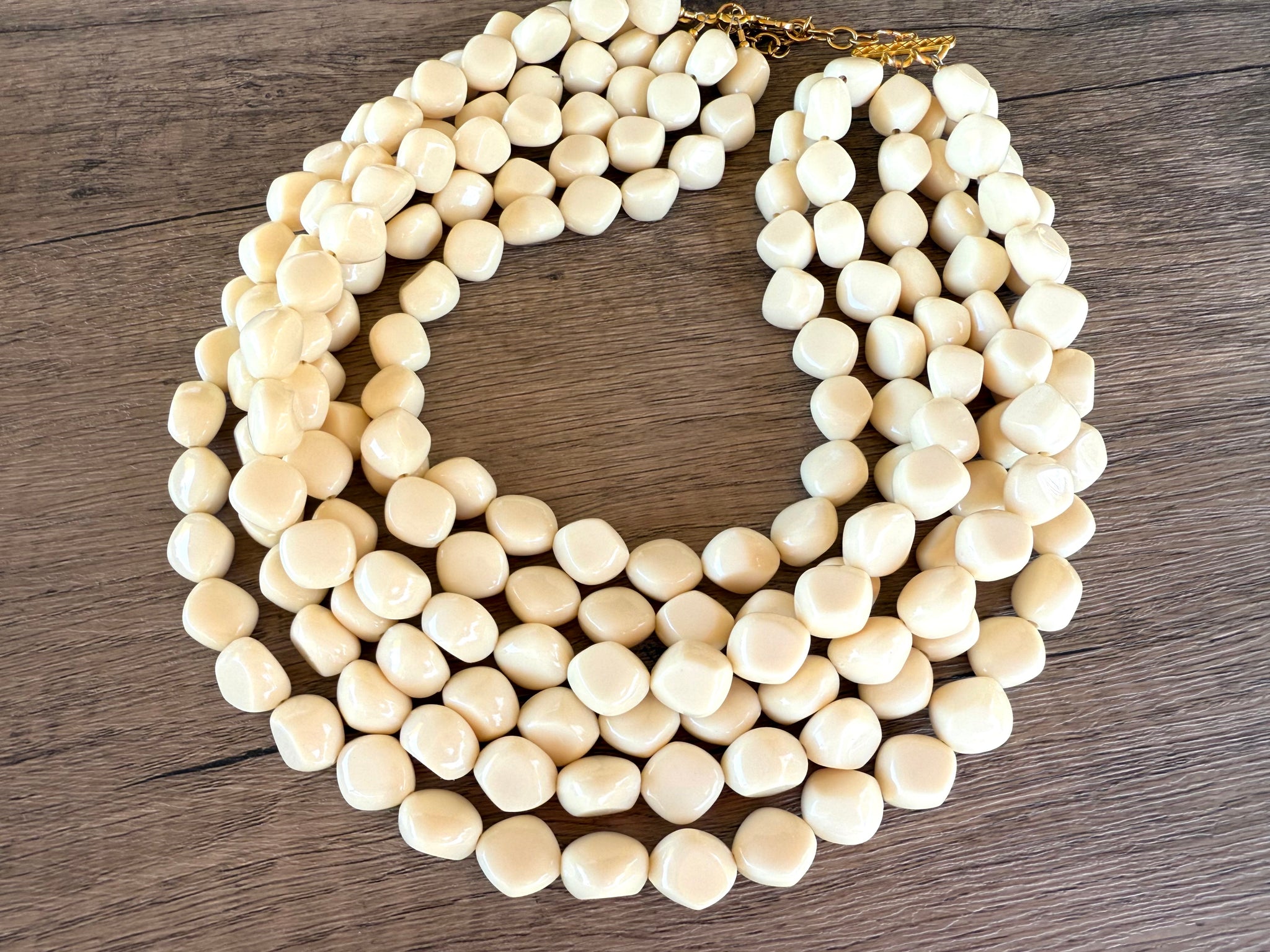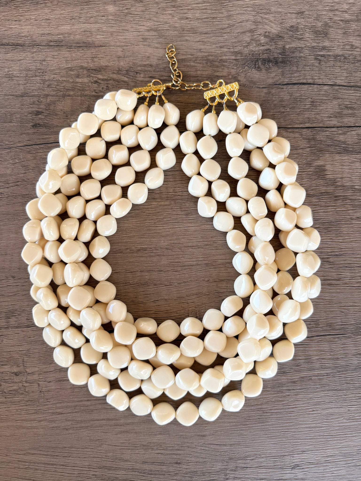 A chunky beaded multi strand statement necklace made with cream lucite beads. This necklace is shown with 5 strands which has some weight to it.