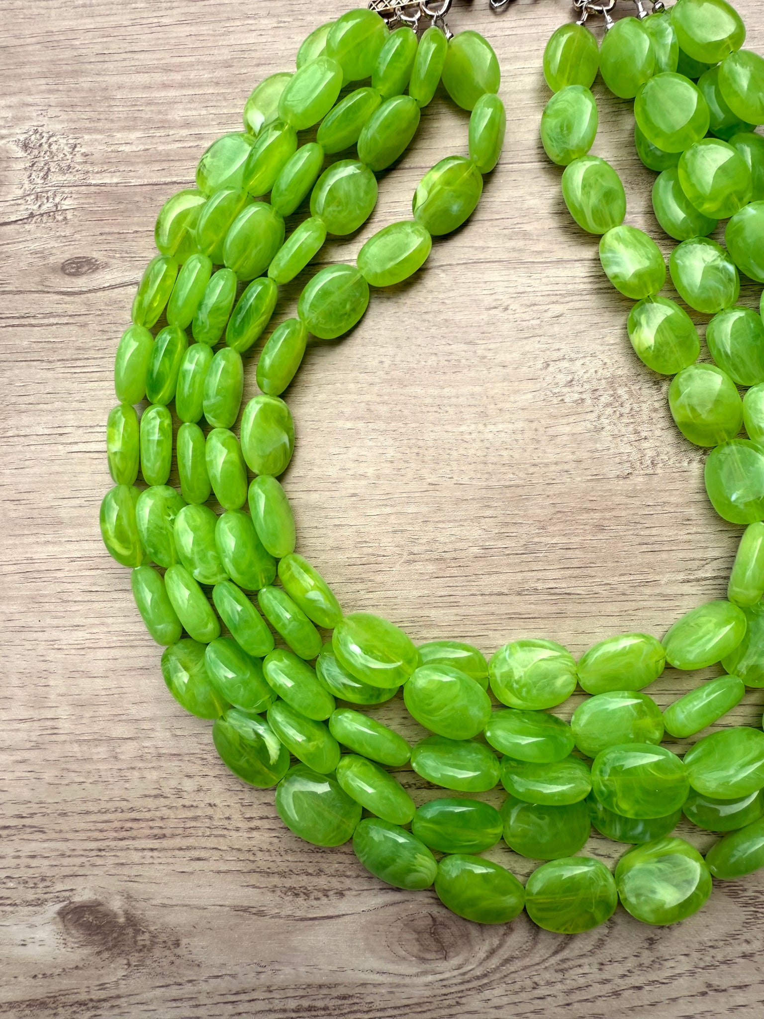 Lime green acrylic beaded statement necklace featuring swirling white patterns. It is lightweight and can be customized with more or less strands.