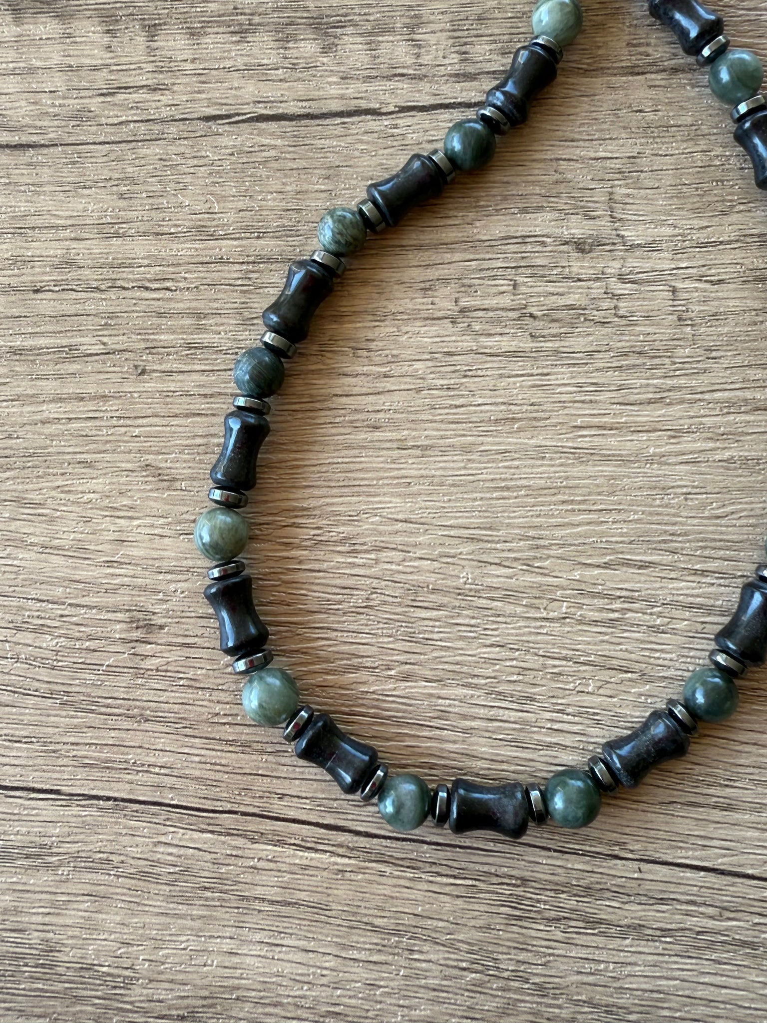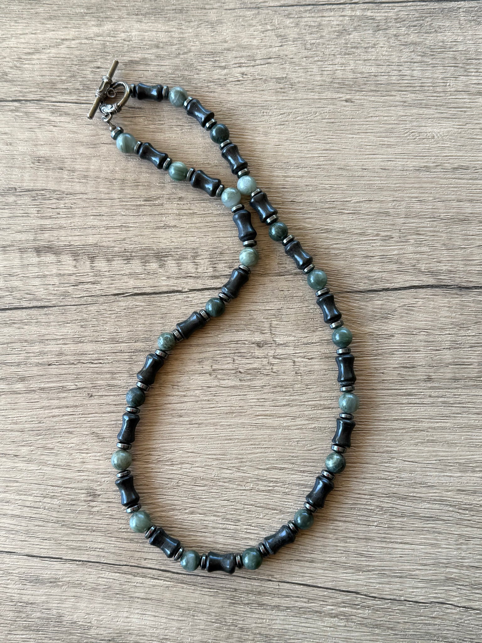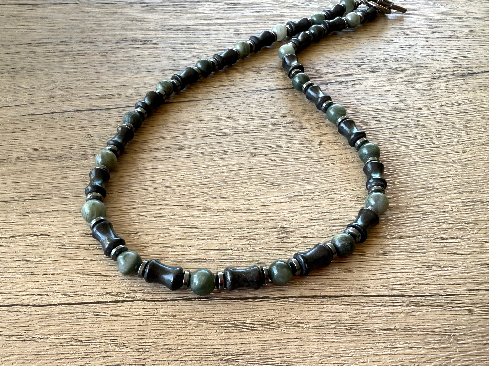 A handcrafted unique medium weight beaded mens necklace made with polished black stone hour glass shaped beads and round greenish gray jasper beads. Makes a great gift for the guy in your life!