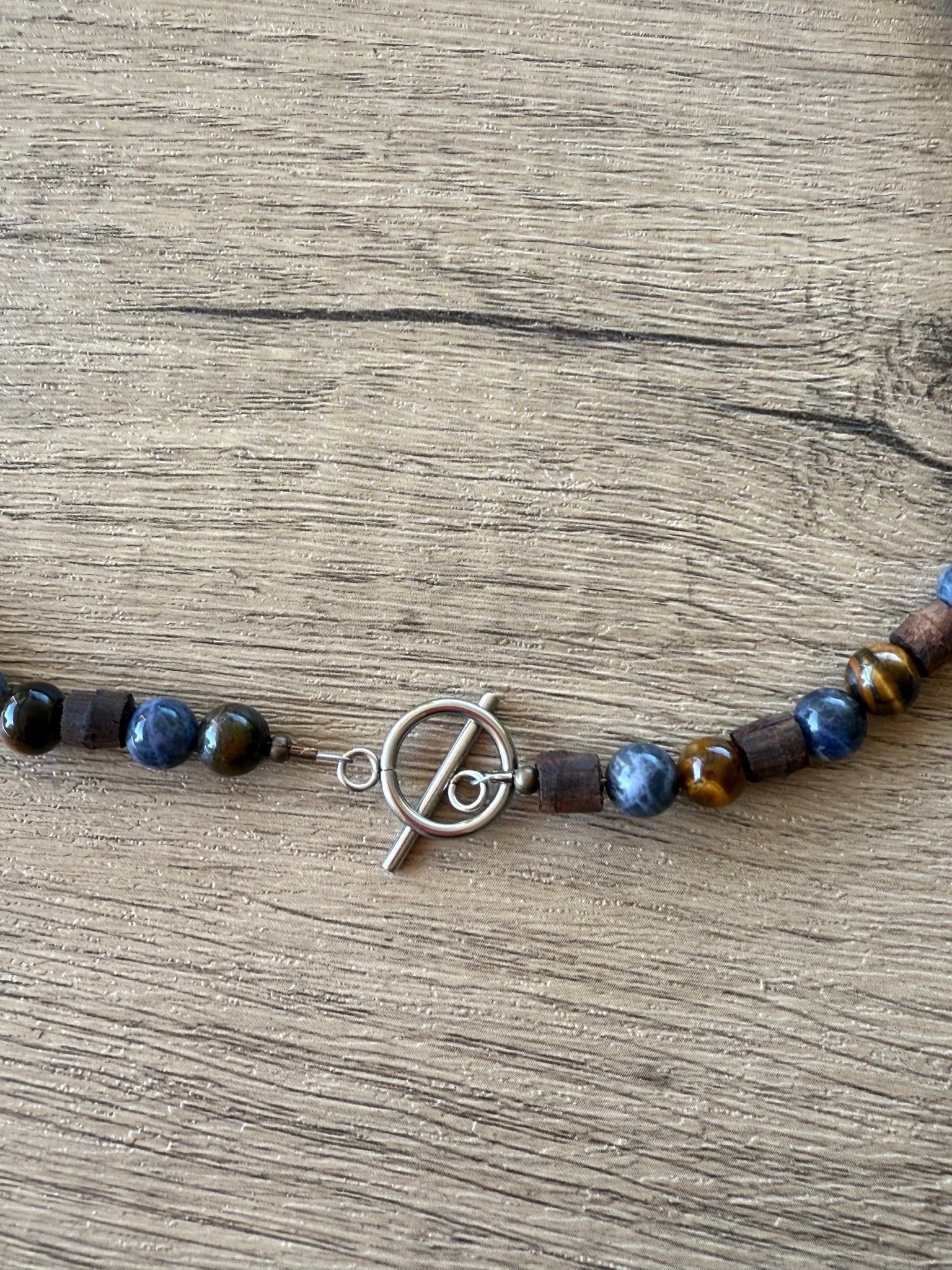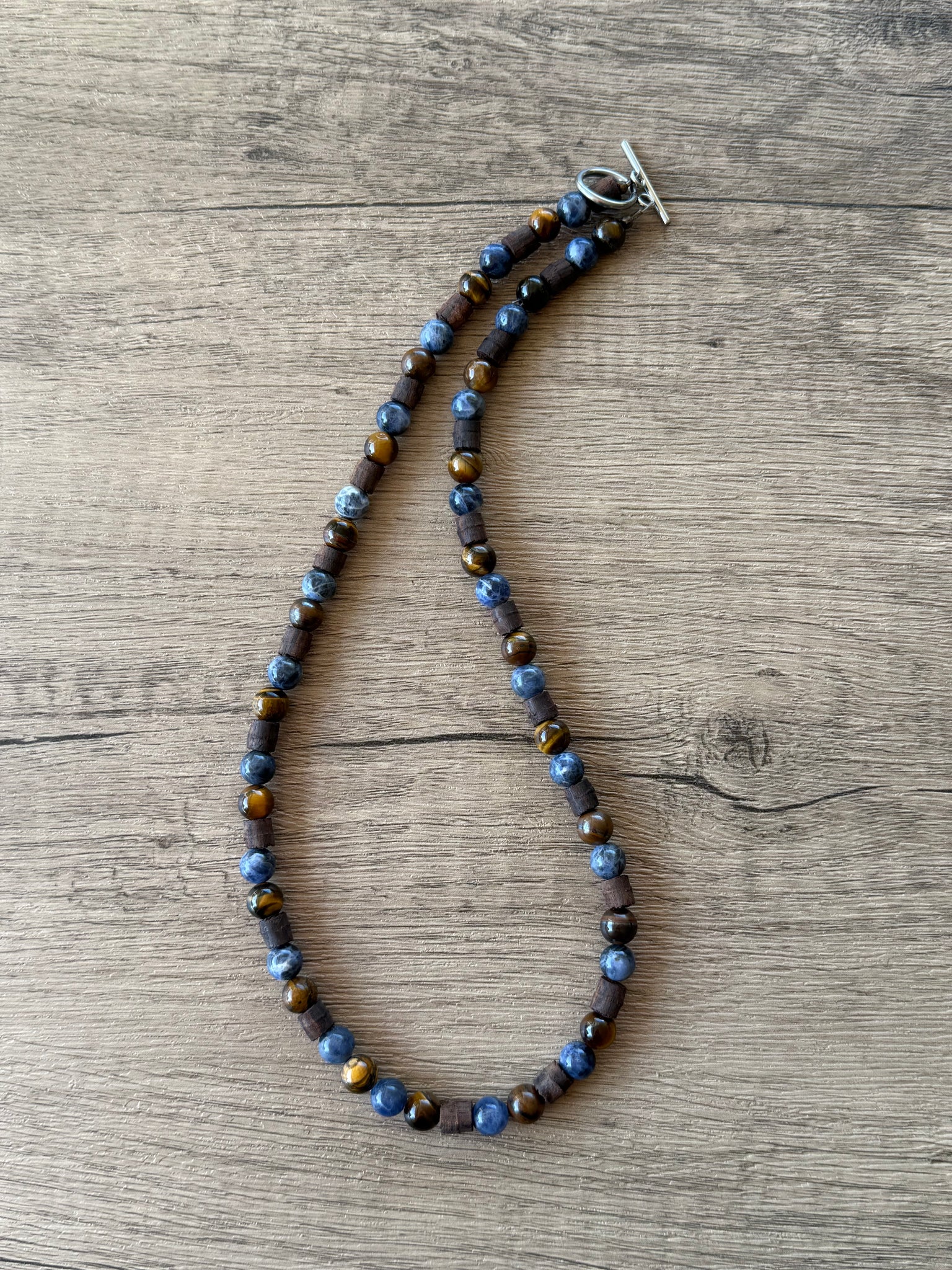 Mens necklace made with blue and white sodalite, brown tigers eye gemstones, wood barrel beads. The necklace is a mix of polished stones and rustic wood beads. The length can be customized and is lightweight and easy to wear.