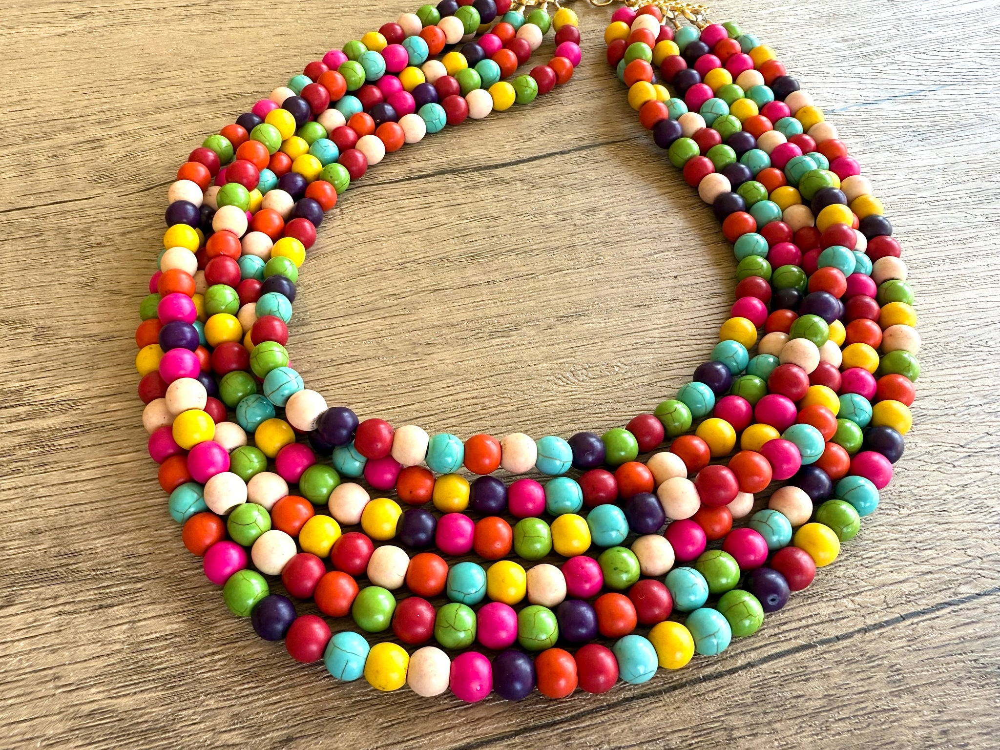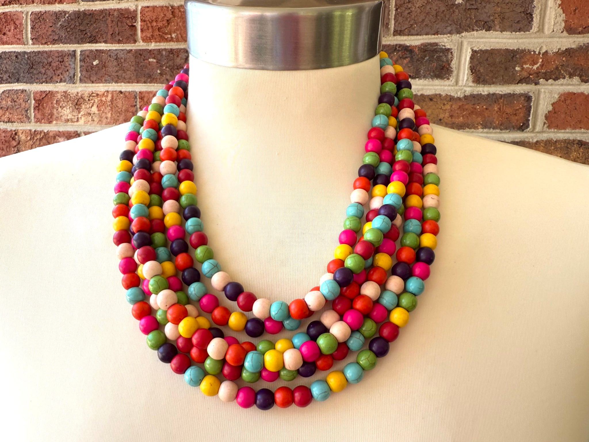 Bright and colorful statement necklace made with magnesite beads. Add a pop of color to your outfit with this necklace.