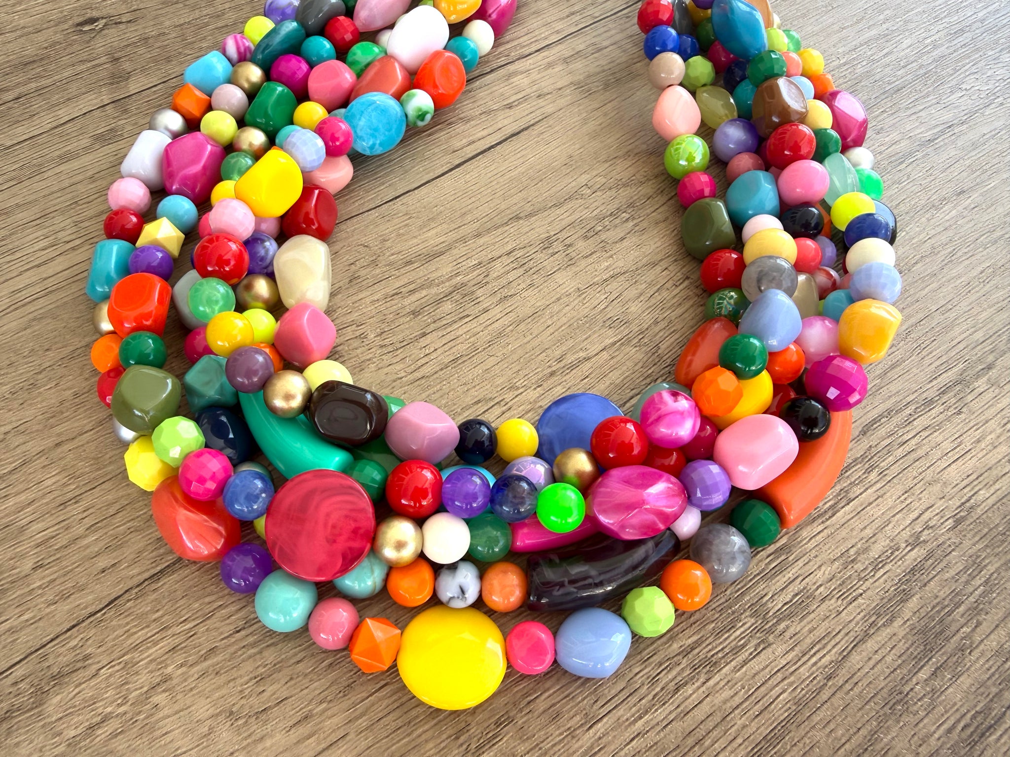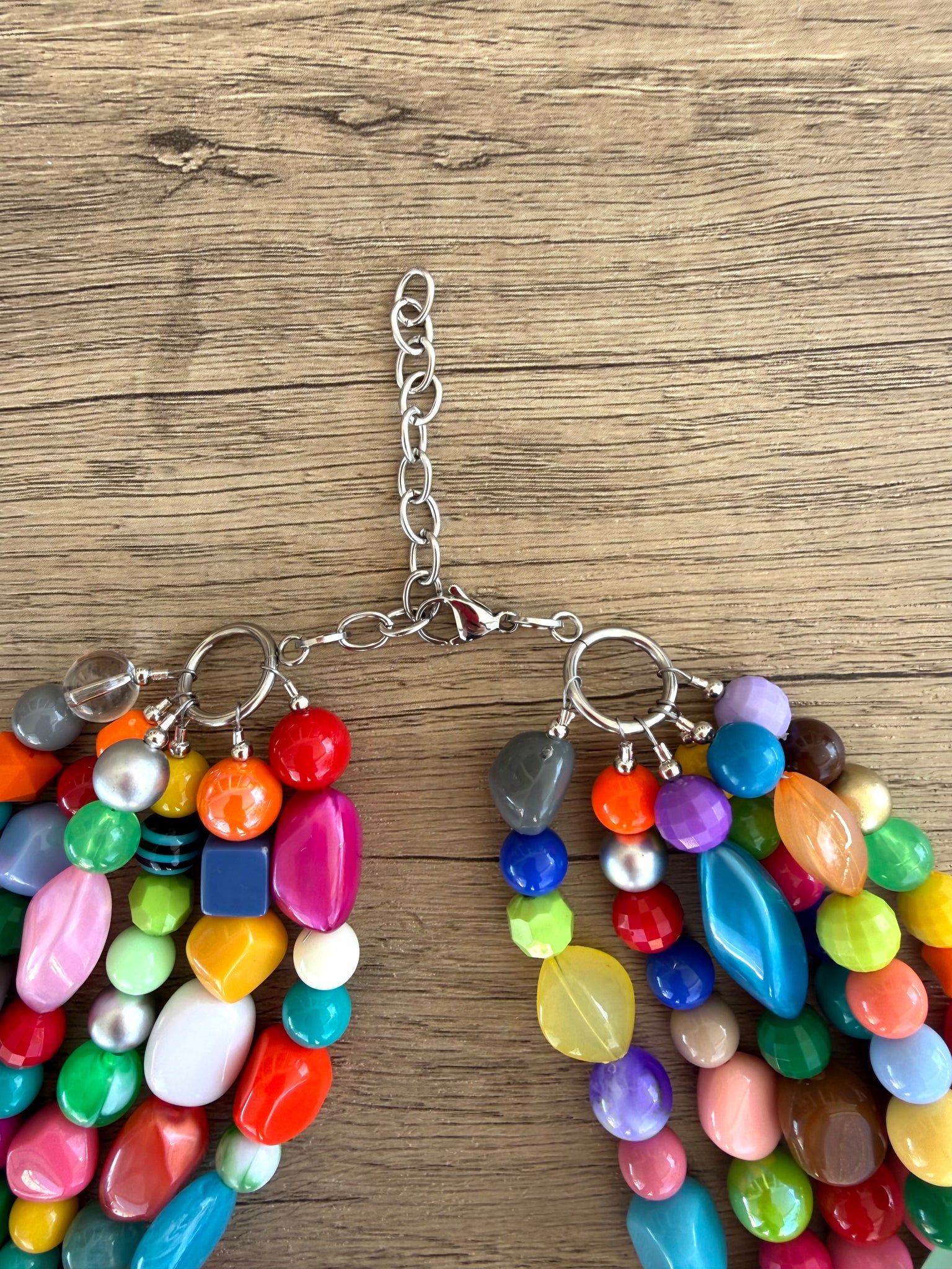 A chunky beaded statement necklace made with various multi color beads. Add a bright pop of color to your wardrobe! This necklace is one of a kind, no two will look the same!