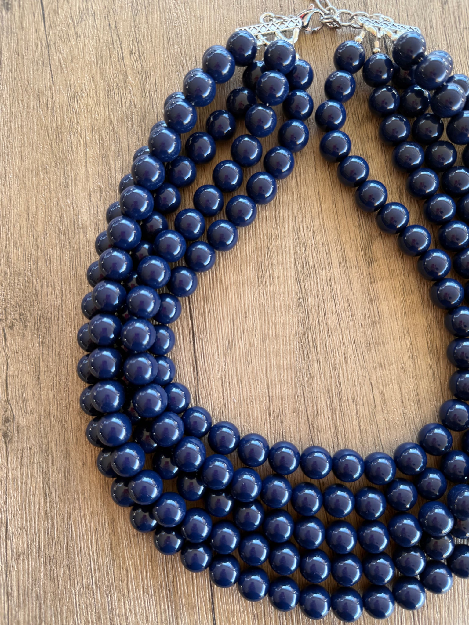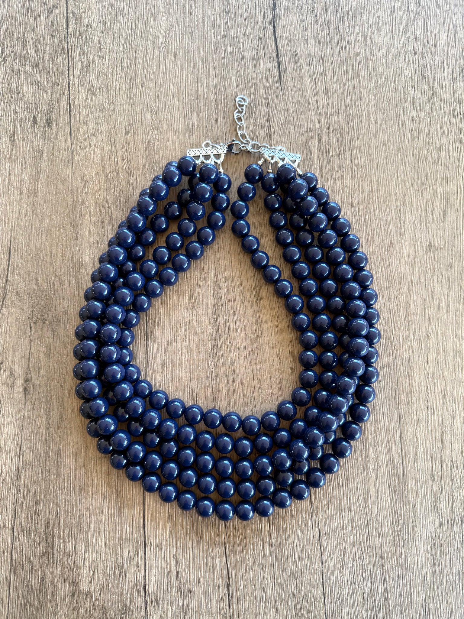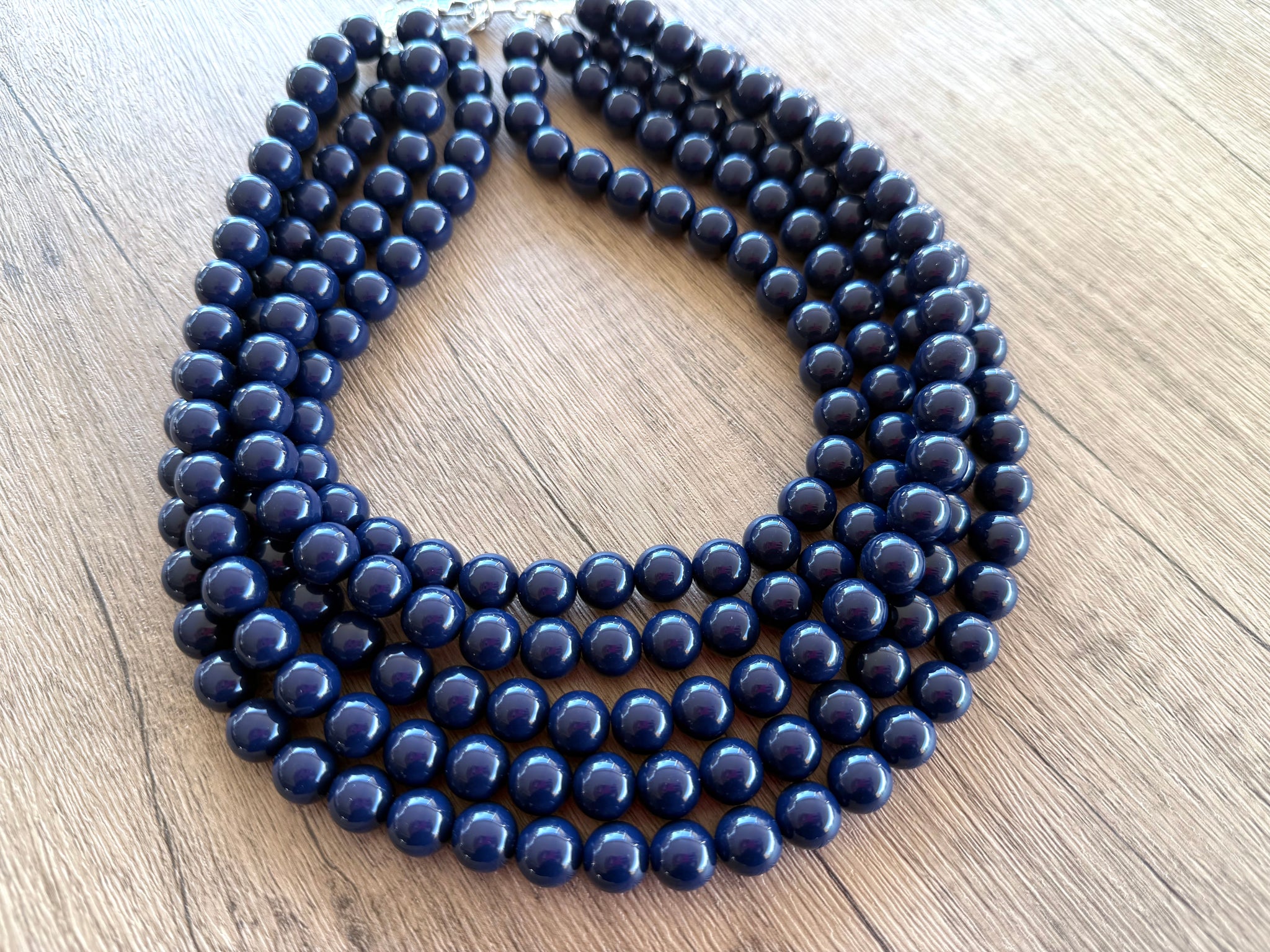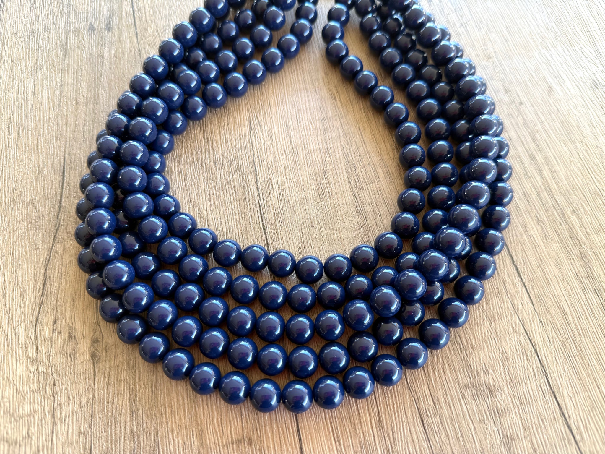 A big 12mm beaded multi strand statement necklace made with navy blue acrylic beads. The necklace has some weight to it in the 5 and 6 strand versions.